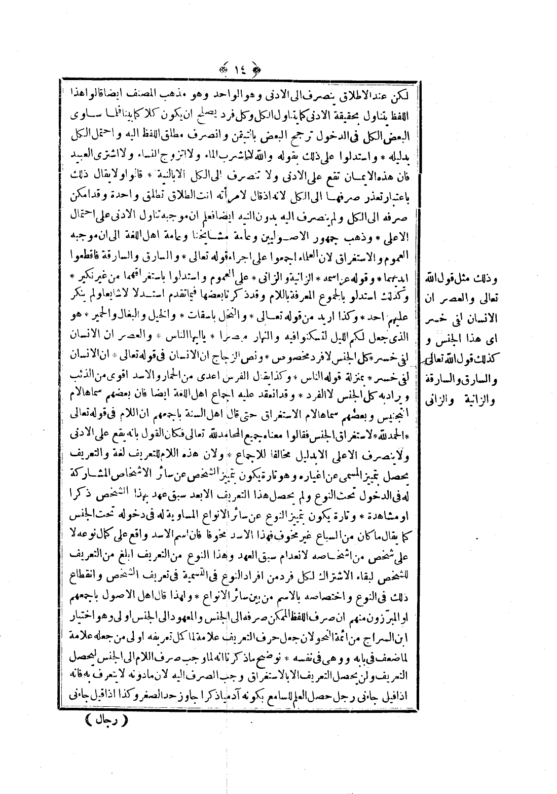 ـــــــــــــــــــــــــــــQلَكِنْ عِنْدَ الْإِطْلَاقِ يَنْصَرِفُ إلَى الْأَدْنَى وَهُوَ الْوَاحِدُ وَهُوَ مَذْهَبُ الْمُصَنِّفِ أَيْضًا قَالُوا هَذَا اللَّفْظُ يَتَنَاوَلُ بِحَقِيقَةِ الْأَدْنَى كَمَا يَتَنَاوَلُ الْكُلَّ وَكُلُّ فَرْدٍ يَصْلُحُ أَنْ يَكُونَ كُلًّا كَمَا بَيَّنَّا فَلَمَّا سَاوَى الْبَعْضُ الْكُلَّ فِي الدُّخُولِ تَرَجَّحَ الْبَعْضُ بِالتَّيَقُّنِ وَانْصَرَفَ مُطْلَقُ اللَّفْظِ إلَيْهِ وَاحْتَمَلَ الْكُلَّ بِدَلِيلِهِ. وَاسْتَدَلُّوا عَلَى ذَلِكَ بِقَوْلِهِ وَاَللَّهِ لَا أَشْرَبُ الْمَاءَ وَلَا أَتَزَوَّجُ النِّسَاءَ وَلَا أَشْتَرِي الْعَبِيدَ فَإِنَّ هَذِهِ الْأَيْمَانَ تَقَعُ عَلَى الْأَدْنَى وَلَا تَنْصَرِفُ إلَى الْكُلِّ إلَّا بِالنِّيَّةِ. قَالُوا وَلَا يُقَالُ ذَلِكَ بِاعْتِبَارِ تَعَذُّرِ صَرْفِهَا إلَى الْكُلِّ؛ لِأَنَّهُ إذْ قَالَ لِامْرَأَتِهِ أَنْتِ الطَّلَاق تَطْلُقُ وَاحِدَةً وَقَدْ أَمْكَنَ صَرْفُهُ إلَى الْكُلِّ وَلَمْ يَنْصَرِفْ إلَيْهِ بِدُونِ النِّيَّةِ أَيْضًا فَعُلِمَ أَنَّ مُوجِبَهُ تَنَاوَلَ الْأَدْنَى عَلَى احْتِمَالِ الْأَعْلَى. وَذَهَبَ جُمْهُورُ الْأُصُولِيِّينَ وَعَامَّةُ مَشَايِخِنَا وَعَامَّةُ أَهْلِ اللُّغَةِ إلَى أَنَّ مُوجِبَهُ الْعُمُومُ وَالِاسْتِغْرَاقُ؛ لِأَنَّ الْعُلَمَاءَ أَجْمَعُوا عَلَى إجْرَاءِ قَوْله تَعَالَى. {وَالسَّارِقُ وَالسَّارِقَةُ فَاقْطَعُوا أَيْدِيَهُمَا} [المائدة: 38] . وَقَوْلِهِ عَزَّ اسْمُهُ. {الزَّانِيَةُ وَالزَّانِي} [النور: 2] . عَلَى الْعُمُومِ وَاسْتَدَلُّوا بِاسْتِغْرَاقِهِمَا مِنْ غَيْرِ نَكِيرٍ. وَكَذَلِكَ اسْتَدَلُّوا بِالْجُمُوعِ الْمُعَرَّفَةِ بِاللَّامِ وَقَدْ ذَكَرْنَا بَعْضَهَا فِيمَا تَقَدَّمَ اسْتِدْلَالًا شَائِعًا وَلَمْ يُنْكِرْ عَلَيْهِمْ أَحَدٌ.