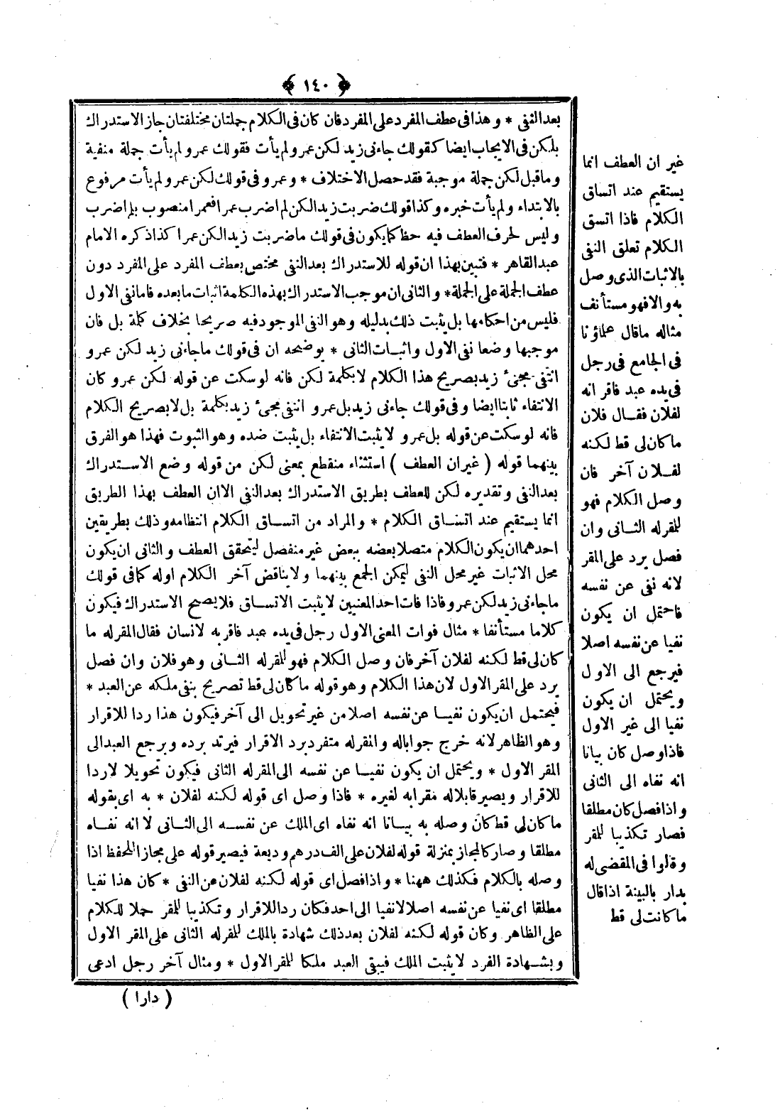 غَيْرَ أَنَّ الْعَطْفَ إنَّمَا يَسْتَقِيمُ عِنْدَ اتِّسَاقِ الْكَلَامِ فَإِذَا اتَّسَقَ الْكَلَامُ تَعَلَّقَ النَّفْيُ بِالْإِثْبَاتِ الَّذِي وُصِلَ بِهِ وَإِلَّا فَهُوَ مُسْتَأْنَفٌ مِثَالُهُ مَا قَالَ عُلَمَاؤُنَا فِي الْجَامِعِ فِي رَجُلٍ فِي يَدِهِ عَبْدٌ فَأَقَرَّ أَنَّهُ لِفُلَانٍ فَقَالَ فُلَانٌ مَا كَانَ لِي قَطُّ لَكِنَّهُ لِفُلَانٍ آخَرَ فَإِنْ وُصِلَ الْكَلَامُ فَهُوَ لِلْمُقَرِّ لَهُ الثَّانِي وَإِنْ فُصِلَ يُرَدُّ عَلَى الْمُقِرِّ لِأَنَّهُ نَفَى عَنْ نَفْسِهِ فَاحْتَمَلَ أَنْ يَكُونَ نَفْيًا عَنْ نَفْسِهِ أَصْلًا فَيَرْجِعُ إلَى الْأَوَّلِ وَيَحْتَمِلُ أَنْ يَكُونَ نَفْيًا إلَى غَيْرِ الْأَوَّلِ فَإِذَا وُصِلَ كَانَ بَيَانًا أَنَّهُ نَفَاهُ إلَى الثَّانِي وَإِذَا فُصِلَ كَانَ مُطْلَقًا فَصَارَ تَكْذِيبًا لِلْمُقِرِّ وَقَالُوا فِي الْمَقْضِيِّ لَهُ بِدَارٍ بِالْبَيِّنَةِ إذَا قَالَ مَا كَانَتْ لِي قَطُّ