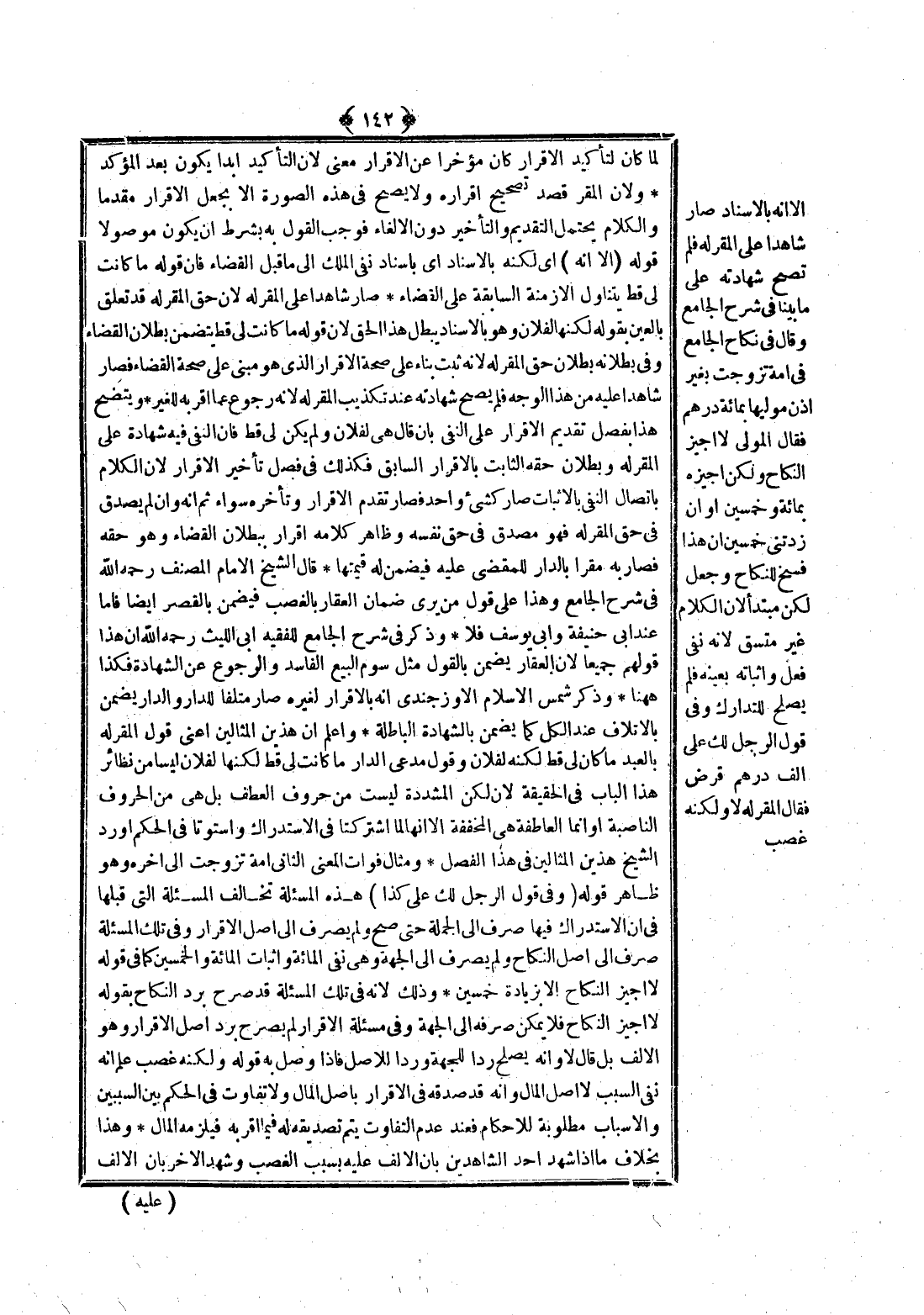 إلَّا أَنَّهُ بِالْإِسْنَادِ صَارَ شَاهِدًا عَلَى الْمُقَرِّ لَهُ فَلَمْ تَصِحَّ شَهَادَتُهُ عَلَى مَا بَيَّنَّا فِي شَرْحِ الْجَامِعِ وَقَالَ فِي نِكَاحِ الْجَامِعِ فِي أَمَةٍ تَزَوَّجَتْ بِغَيْرِ إذْنِ مَوْلَاهَا بِمِائَةِ دِرْهَمٍ فَقَالَ الْمَوْلَى لَا أُجِيزُ النِّكَاحَ وَلَكِنْ أُجِيزُهُ بِمِائَةٍ وَخَمْسِينَ أَوْ إنْ زِدْتنِي خَمْسِينَ أَنَّ هَذَا فَسْخٌ لِلنِّكَاحِ وَجُعِلَ لَكِنْ مُبْتَدَأً لِأَنَّ الْكَلَامَ غَيْرُ مُتَّسِقٍ لِأَنَّهُ نَفْيُ فِعْلٍ وَإِثْبَاتُهُ بِعَيْنِهِ فَلَمْ يَصْلُحْ لِلتَّدَارُكِ وَفِي قَوْلِ الرَّجُلِ لَك عَلَيَّ أَلْفُ دِرْهَمٍ قَرْضٌ فَقَالَ الْمُقَرُّ لَهُ لَا وَلَكِنَّهُ غَصْبٌ