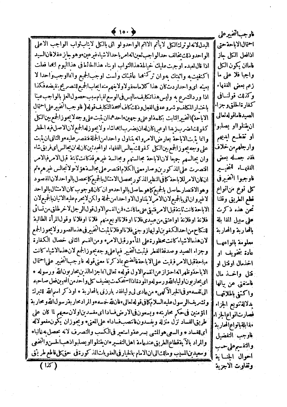 فَأَوْجَبَ التَّخْيِيرَ عَلَى احْتِمَالِ الْإِبَاحَةِ حَتَّى إذَا فَعَلَ الْكُلَّ جَازَ فَأَمَّا أَنْ يَكُونَ الْكُلُّ وَاجِبًا فَلَا عَلَى مَا زَعَمَ بَعْضُ الْفُقَهَاءِ وَكَذَلِكَ قَوْلُنَا فِي كَفَّارَةِ الْحَلْقِ وَجَزَاءِ الصَّيْدِ فَأَمَّا قَوْله تَعَالَى {أَنْ يُقَتَّلُوا أَوْ يُصَلَّبُوا أَوْ تُقَطَّعَ أَيْدِيهِمْ وَأَرْجُلُهُمْ مِنْ خِلافٍ} [المائدة: 33] فَقَدْ جَعَلَهُ بَعْضُ الْفُقَهَاءِ لِلتَّخْيِيرِ فَأَوْجَبُوا التَّخْيِيرَ فِي كُلِّ نَوْعٍ مِنْ أَنْوَاعِ قَطْعِ الطَّرِيقِ وَقُلْنَا نَحْنُ هَذِهِ ذُكِرَتْ عَلَى سَبِيلِ الْمُقَابَلَةِ بِالْمُحَارَبَةِ وَالْمُحَارَبَةُ مَعْلُومَةٌ بِأَنْوَاعِهَا عَادَةً بِتَخْوِيفٍ أَوْ أَخْذِ مَالٍ أَوْ قَتْلٍ أَوْ قَتْلٍ وَأَخْذِ مَالٍ فَاسْتَغْنَى عَنْ بَيَانِهَا وَاكْتَفَى بِإِطْلَاقِهَا بِدَلَالَةِ تَنْوِيعِ الْجَزَاءِ فَصَارَتْ أَنْوَاعُ الْجَزَاءِ مُقَابَلَةً بِأَنْوَاعِ الْمُحَارَبَةِ فَأَوْجَبَ التَّفْضِيلَ وَالتَّقْسِيمَ عَلَى حَسَبِ أَحْوَالِ الْجِنَايَةِ وَتَفَاوُتِ الْأَجْزِيَةِ