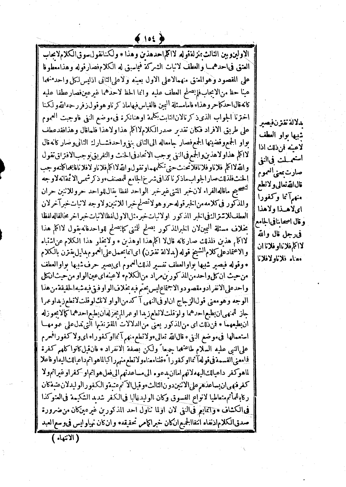 وَلَا يَخْلُو هَذَا الْكَلَامُ عَنْ اشْتِبَاهٍ وَالِاعْتِمَادُ عَلَى كَلَامِ الشَّيْخِ قَوْلُهُ (بِدَلَالَةٍ تَقْتَرِنُ) أَيْ إنَّمَا يُحْمَلُ عَلَى الْعُمُومِ بِدَلِيلٍ يَقْتَرِنُ بِالْكَلَامِ وَقَوْلُهُ فَيَصِيرُ شَبِيهًا بِوَاوِ الْعَطْفِ تَفْسِيرٌ لِذَلِكَ الْعُمُومِ أَيْ يَصِيرُ حَرْفٌ شَبِيهًا بِوَاوِ الْعَطْفِ مِنْ حَيْثُ إنَّ كُلَّ وَاحِدٍ مِنْ الْمَذْكُورَيْنِ مُرَادٌ مِنْ الْكَلَامِ لَا عَيْنَهُ أَيْ عَيْنَ الْوَاوِ مِنْ حَيْثُ إنَّ كُلَّ وَاحِدٍ عَلَى الِانْفِرَادِ مَقْصُودٌ وَالِاجْتِمَاعُ لَيْسَ بِحَتْمٍ فِيهِ بِخِلَافِ الْوَاوِ فَبَقِيَ فِيهِ شَبَهُ الْحَقِيقَةِ مِنْ هَذَا الْوَجْهِ وَهُوَ مَعْنَى قَوْلِ الزَّجَّاجِ إنَّ أَوْ فِي النَّهْيِ آكَدُ مِنْ الْوَاوِ لِأَنَّك لَوْ قُلْت لَا تُطِعْ زَيْدًا وَعَمْرًا جَازَ لِلْمَنْهِيِّ أَنْ يُطِيعَ أَحَدَهُمَا وَلَوْ قُلْت لَا تُطِعْ زَيْدًا أَوْ عَمْرًا لَمْ يَجُزْ لَهُ أَنْ يُطِيعَ أَحَدَهُمَا كَمَا لَا يَجُوزُ لَهُ أَنْ يُطِيعَهُمَا فَمِنْ ذَلِكَ أَيْ مِنْ الْمَذْكُورِ يَعْنِي مِنْ الدَّلَالَاتِ الْمُقْتَرِنَةِ بِهَا الَّتِي تَدُلُّ عَلَى عُمُومِهَا اسْتِعْمَالُهَا فِي مَوْضِعِ النَّفْيِ قَالَ اللَّهُ تَعَالَى {وَلا تُطِعْ مِنْهُمْ آثِمًا أَوْ كَفُورًا} [الإنسان: 24] أَيْ وَلَا كَفُورًا فَحَرُمَ عَلَى النَّبِيِّ - عَلَيْهِ السَّلَامُ - طَاعَتُهُمَا جَمِيعًا وَلَكِنْ بِصِفَةِ الِانْفِرَادِ.