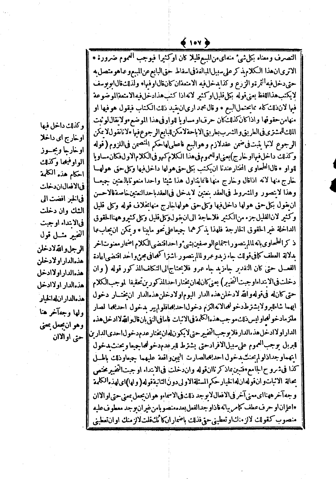 وَقَالَ مُحَمَّدٌ أَرَى أَنْ يُقَيِّدَ ذَلِكَ الْكِتَابَ فَيَقُولَ هُوَ فِيهَا أَوْ مِنْهَا مِنْ حُقُوقِهَا وَإِذَا كَانَ كَذَلِكَ كَانَ حَرْفُ أَوْ مُسَاوِيًا لِلْوَاوِ فِي هَذَا الْمَوْضِعِ وَلَا يُقَالُ لَوْ ثَبَتَ الْمِلْكُ لِلْمُشْتَرِي فِي الطَّرِيقِ وَالشُّرْبِ بِطَرِيقِ الْإِبَاحَةِ لَأَمْكَنَ لِلْبَائِعِ الرُّجُوعُ فِيهَا لِأَنَّا نَقُولُ لَا يُمْكِنُ الرُّجُوعُ لِأَنَّهَا يَثْبُتُ فِي ضِمْنِ عَقْدٍ لَازِمٍ وَهُوَ الْبَيْعُ فَأَعْطَى لَهَا حُكْمَ الْمُتَضَمَّنِ فِي اللُّزُومِ (قَوْلُهُ وَكَذَلِكَ دَاخِلٌ فِيهَا أَوْ خَارِجٌ) يَعْنِي أَوْ لِلْعُمُومِ فِي هَذَا الْكَلَامِ كَهُوَ فِي الْكَلَامِ الْأَوَّلِ فَكَانَ مُسَاوِيًا لِلْوَاوِ قَالَ الطَّحَاوِيَّ الْمُخْتَارُ عِنْدَنَا أَنْ يَكْتُبَ بِكُلِّ حَقٍّ هُوَ لَهَا دَاخِلٍ فِيهَا وَكُلِّ حَقٍّ هُوَ لَهَا خَارِجٍ مِنْهَا لِأَنَّهُ إذَا قَالَ وَخَارِجٍ مِنْهَا فَإِنَّمَا يَتَنَاوَلُ هَذَا شَيْئًا وَاحِدًا مَنْعُوتًا بِالنَّعْتَيْنِ جَمِيعًا وَهَذَا لَا يُتَصَوَّرُ وَالْمَشْرُوطُ فِي الْعَقْدِ بِنَعْتَيْنِ لَا يَدْخُلُ فِي الْعَقْدِ بِأَحَدِ النَّعْتَيْنِ خَاصَّةً فَالْأَحْسَنُ أَنْ يَقُولَ بِكُلِّ حَقٍّ هُوَ لَهَا دَاخِلٍ فِيهَا وَكُلِّ حَقٍّ هُوَ لَهَا خَارِجٍ مِنْهَا بِخِلَافِ قَوْلِهِ وَكُلِّ قَلِيلٍ وَكَثِيرٍ لِأَنَّ الْقَلِيلَ جُزْءٌ مِنْ الْكَثِيرِ فَلَا حَاجَةَ إلَى أَنْ يَقُولَ وَكُلِّ قَلِيلٍ وَكُلٍّ كَثِيرٍ وَهَهُنَا الْحُقُوقُ الدَّاخِلَةُ غَيْرُ الْحُقُوقِ الْخَارِجَةِ فَلِهَذَا يَذْكُرُهُمَا جَمِيعًا عَلَى نَحْوِ مَا بَيَّنَّا وَيُمْكِنُ أَنْ يُجَابَ عَمَّا ذَكَرَ الطَّحَاوِيَّ بِأَنَّهُ لَمَّا لَمْ يُتَصَوَّرْ اجْتِمَاعُ الْوَصْفَيْنِ بِشَيْءٍ وَاحِدٍ اقْتَضَى الْكَلَامُ إضْمَارَ مَنْعُوتٍ آخَرَ بِدَلَالَةِ الْعَطْفِ كَمَا فِي قَوْلِك جَاءَ زَيْدٌ وَعَمْرٌو لَمَّا لَمْ يُتَصَوَّرْ اشْتِرَاكُهُمَا فِي مَجِيءِ وَاحِدٍ اقْتَضَى إعَادَةَ الْفِعْلِ حَتَّى كَانَ التَّقْدِيرُ جَاءَ زَيْدٌ جَاءَ عَمْرٌو فَلَا يَحْتَاجُ إلَى التَّكَلُّفِ الْمَذْكُورِ