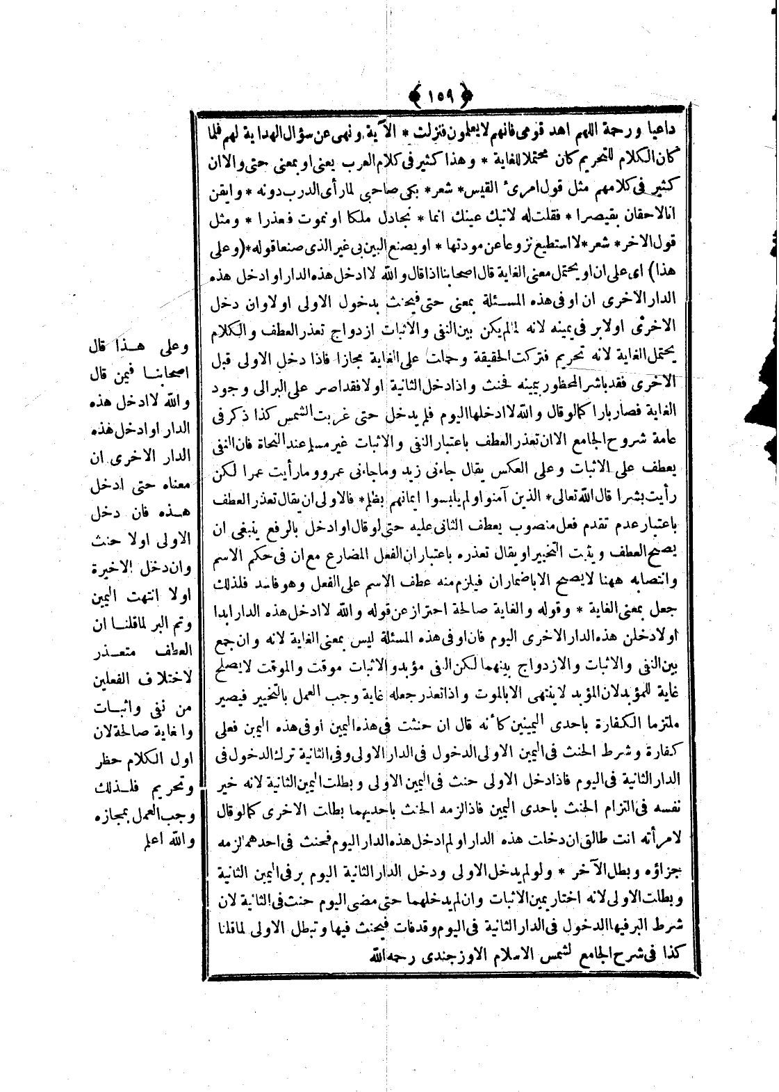وَعَلَى هَذَا قَالَ أَصْحَابُنَا فِيمَنْ قَالَ وَاَللَّهِ لَا أَدْخُلُ هَذِهِ الدَّارَ أَوْ أَدْخُلَ هَذِهِ الدَّارَ الْأُخْرَى إنَّ مَعْنَاهُ حَتَّى أَدْخُلَ هَذِهِ فَإِنْ دَخَلَ الْأُولَى أَوَّلًا حَنِثَ وَإِنْ دَخَلَ الْأَخِيرَةَ أَوَّلًا انْتَهَتْ الْيَمِينُ وَتَمَّ الْبِرُّ لِمَا قُلْنَا إنَّ الْعَطْفَ مُتَعَذِّرٌ لِاخْتِلَافِ الْفِعْلَيْنِ مِنْ نَفْيٍ وَإِثْبَاتٍ وَالْغَايَةُ صَالِحَةٌ لِأَنَّ أَوَّلَ الْكَلَامِ حَظْرٌ وَتَحْرِيمٌ فَلِذَلِكَ وَجَبَ الْعَمَلُ بِمَجَازِهِ وَاَللَّهُ أَعْلَمُ