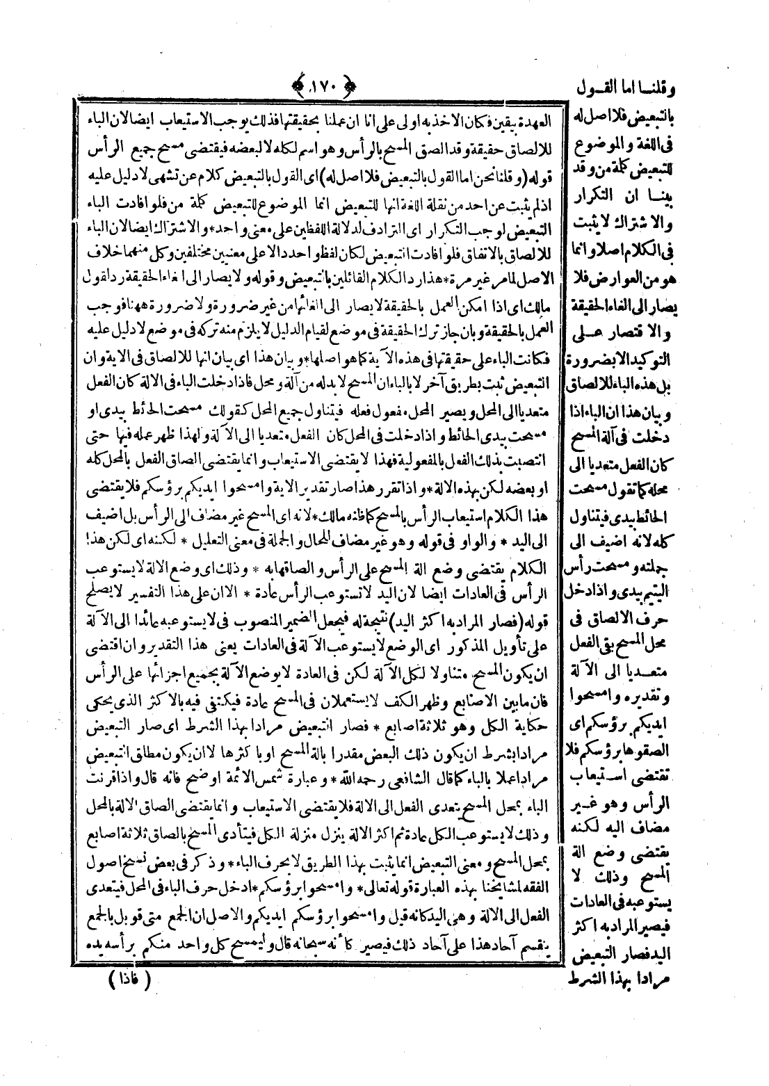 ـــــــــــــــــــــــــــــQالْعُهْدَةِ بِيَقِينٍ فَكَانَ الْأَخْذُ بِهِ أَوْلَى عَلَى أَنَّا إنْ عَمِلْنَا بِحَقِيقَتِهَا فَذَلِكَ يُوجِبُ الِاسْتِيعَابَ أَيْضًا لِأَنَّ الْبَاءَ لِلْإِلْصَاقِ حَقِيقَةً وَقَدْ أَلْصَقَ الْمَسْحَ بِالرَّأْسِ وَهُوَ اسْمٌ لِكُلِّهِ لَا لِبَعْضِهِ فَيَقْتَضِي مَسْحَ جَمِيعِ الرَّأْسِ قَوْلُهُ (وَقُلْنَا نَحْنُ أَمَّا الْقَوْلُ بِالتَّبْعِيضِ فَلَا أَصْلَ لَهُ) أَيْ الْقَوْلُ بِالتَّبْعِيضِ كَلَامٌ عَنْ تَشَهٍّ لَا دَلِيلَ عَلَيْهِ إذْ لَمْ يَثْبُتْ عَنْ أَحَدٍ مِنْ نَقَلَةِ اللُّغَةِ أَنَّهَا لِلتَّبْعِيضِ إنَّمَا الْمَوْضُوعُ لِلتَّبْعِيضِ كَلِمَةُ مِنْ فَلَوْ أَفَادَتْ الْبَاءُ التَّبْعِيضَ لَوَجَبَ التَّكْرَارُ أَيْ التَّرَادُفُ لِدَلَالَةِ اللَّفْظَيْنِ عَلَى مَعْنَى وَاحِدٍ.