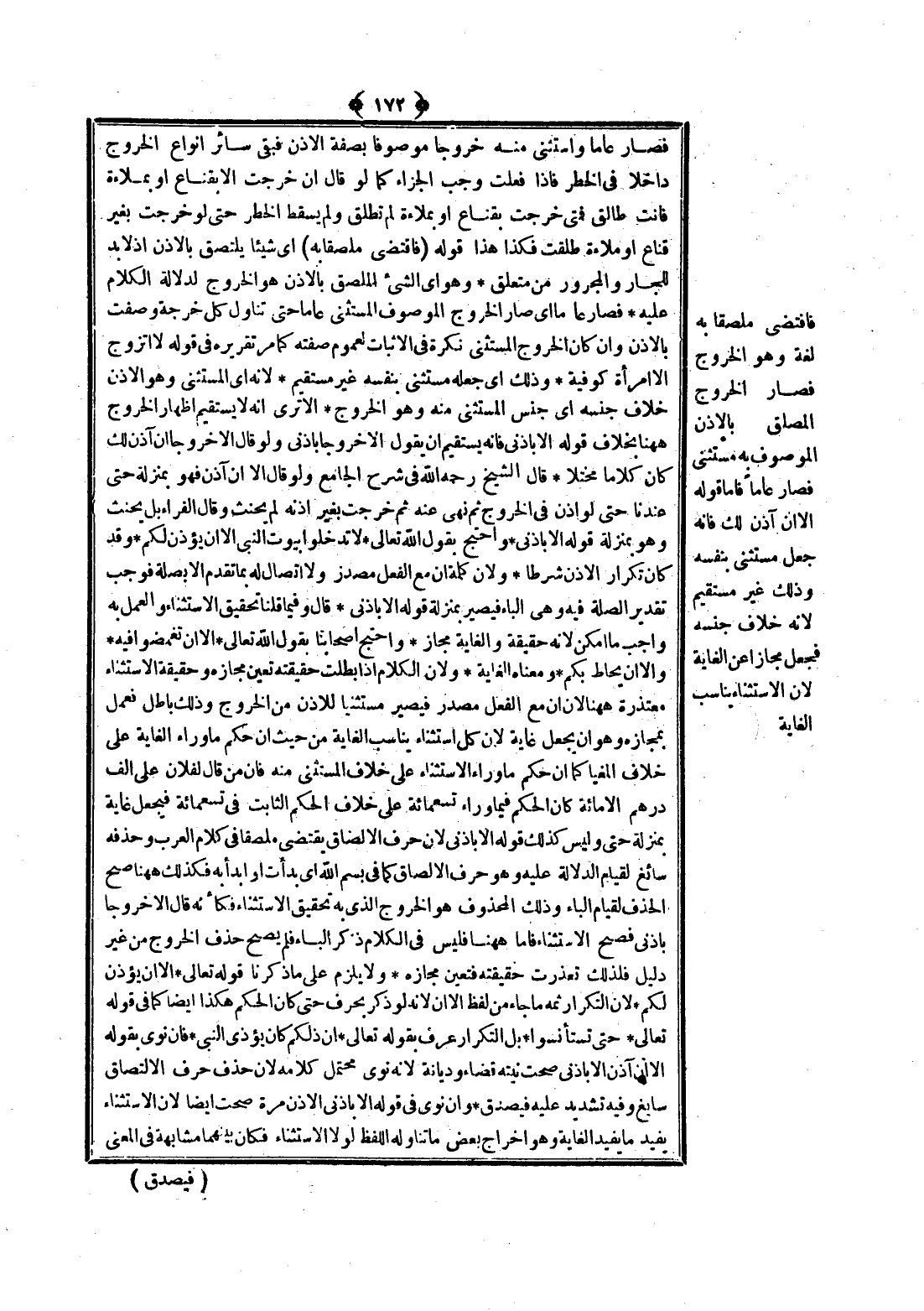 فَاقْتَضَى مُلْصَقًا بِهِ لُغَةً وَهُوَ الْخُرُوجُ فَصَارَ الْخُرُوجُ الْمُصْلَقُ بِالْإِذْنِ الْمَوْصُوفِ بِهِ مُسْتَثْنًى فَصَارَ عَامًّا فَأَمَّا قَوْلُهُ إلَّا أَنْ آذَنَ لَك فَإِنَّهُ جُعِلَ مُسْتَثْنَى بِنَفْسِهِ وَذَلِكَ غَيْرُ مُسْتَقِيمٍ لِأَنَّهُ خِلَافُ جِنْسِهِ فَجُعِلَ مَجَازًا عَنْ الْغَايَةِ لِأَنَّ الِاسْتِثْنَاءَ يُنَاسِبُ الْغَايَةَ.