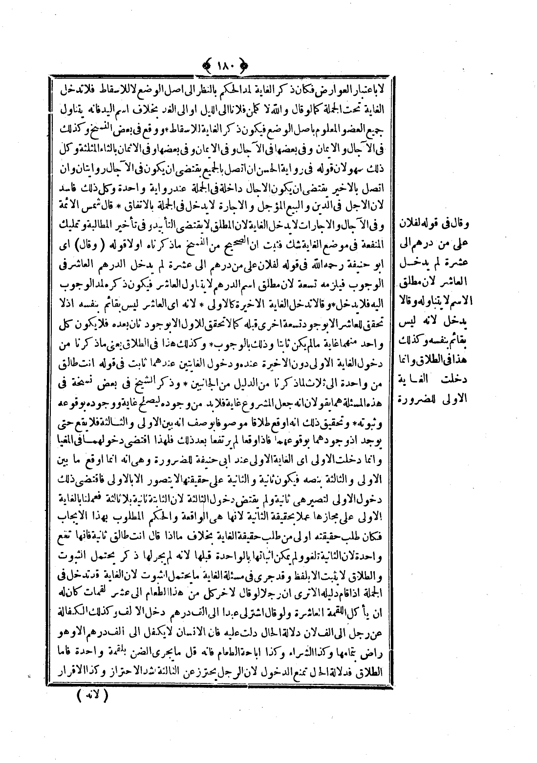 ـــــــــــــــــــــــــــــQلَا بِاعْتِبَارِ الْعَوَارِضِ فَكَانَ ذِكْرُ الْغَايَةِ لِمَدِّ الْحُكْمِ بِالنَّظَرِ إلَى أَصْلِ الْوَضْعِ لَا لِلْإِسْقَاطِ فَلَا تَدْخُلُ الْغَايَةُ تَحْتَ الْجُمْلَةِ كَمَا لَوْ قَالَ وَاَللَّهِ لَأُكَلِّمَنَّ فُلَانًا إلَى اللَّيْلِ أَوْ إلَى الْغَدِ بِخِلَافِ اسْمِ الْيَدِ فَإِنَّهُ يَتَنَاوَلُ جَمِيعَ الْعُضْوِ الْمَعْلُومِ بِأَصْلِ الْوَضْعِ فَيَكُونُ ذِكْرُ الْغَايَةِ لِلْإِسْقَاطِ. وَوَقَعَ فِي بَعْضِ النُّسَخِ وَكَذَلِكَ فِي الْآجَالِ وَالْأَيْمَانِ وَفِي بَعْضِهَا فِي الْآجَالِ وَفِي الْأَيْمَانِ وَفِي بَعْضِهَا وَفِي الْأَثْمَانِ بِالثَّاءِ الْمُثَلَّثَةِ وَكُلُّ ذَلِكَ سَهْوٌ لِأَنَّ قَوْلَهُ فِي رِوَايَةِ الْحَسَنِ إنْ اتَّصَلَ بِالْجَمِيعِ يَقْتَضِي أَنْ يَكُونَ فِي الْآجَالِ رِوَايَتَانِ وَإِنْ اتَّصَلَ بِالْأَخِيرِ يَقْتَضِي أَنْ يَكُونَ الْآجَالُ دَاخِلَةً فِي الْجُمْلَةِ عِنْدَ رِوَايَةٍ وَاحِدَةٍ وَكُلُّ ذَلِكَ فَاسِدٌ لِأَنَّ الْأَجَلَ فِي الدَّيْنِ وَالْبَيْعِ الْمُؤَجَّلِ وَالْإِجَارَةِ لَا يَدْخُلُ فِي الْجُمْلَةِ بِالِاتِّفَاقِ. قَالَ شَمْسُ الْأَئِمَّةِ وَفِي الْآجَالِ وَالْإِجَارَاتِ لَا يَدْخُلُ الْغَايَةُ لِأَنَّ الْمُطْلَقَ لَا يَقْتَضِي التَّأْبِيدَ وَفِي تَأْخِيرِ الْمُطَالَبَةِ وَتَمْلِيكِ الْمَنْفَعَةِ فِي مَوْضِعِ الْغَايَةِ شَكٌّ فَثَبَتَ أَنَّ الصَّحِيحَ مِنْ النُّسَخِ مَا ذَكَرْنَاهُ أَوَّلًا قَوْلُهُ (وَقَالَ) أَيْ أَبُو حَنِيفَةَ - رَحِمَهُ اللَّهُ - فِي قَوْلِهِ لِفُلَانٍ عَلَيَّ مِنْ دِرْهَمٍ إلَى عَشْرَةٍ لَمْ يَدْخُلْ الدِّرْهَمُ الْعَاشِرُ فِي الْوُجُوبِ فَيَلْزَمُهُ تِسْعَةٌ لِأَنَّ مُطْلَقَ اسْمِ الدِّرْهَمِ لَا يَتَنَاوَلُ الْعَاشِرَ فَيَكُونُ ذِكْرُهُ لِمَدِّ الْوُجُوبِ إلَيْهِ فَلَا يَدْخُلُ.
