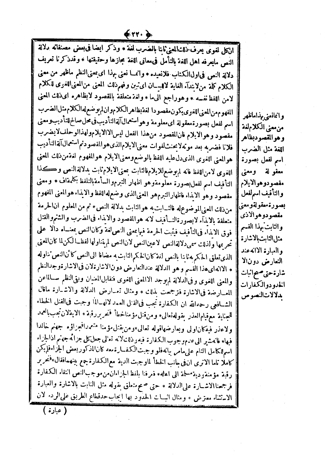 وَإِنَّمَا نَعْنِي بِهَذَا مَا ظَهَرَ وَمِنْ مَعْنَى الْكَلَامِ لُغَةً وَهُوَ الْمَقْصُودُ بِظَاهِرِ اللُّغَةِ مِثْلُ الضَّرْبِ اسْمٌ لِفِعْلٍ بِصُورَةٍ مَعْقُولَةٍ وَمَعْنَى مَقْصُودٍ وَهُوَ الْإِيلَامُ وَالتَّأْفِيفُ اسْمٌ لِفِعْلٍ بِصُورَةٍ مَعْقُولَةٍ وَمَعْنَى مَقْصُودٍ وَهُوَ الْأَذَى وَالثَّابِتُ بِهَذَا الْقِسْمِ مِثْلُ الثَّابِتِ بِالْإِشَارَةِ وَالْعِبَارَةِ، إلَّا أَنَّهُ عِنْدَ التَّعَارُضِ دُونَ الْإِشَارَةِ حَتَّى صَحَّ إثْبَاتُ الْحُدُودِ وَالْكَفَّارَاتِ بِدَلَالَاتِ النُّصُوصِ