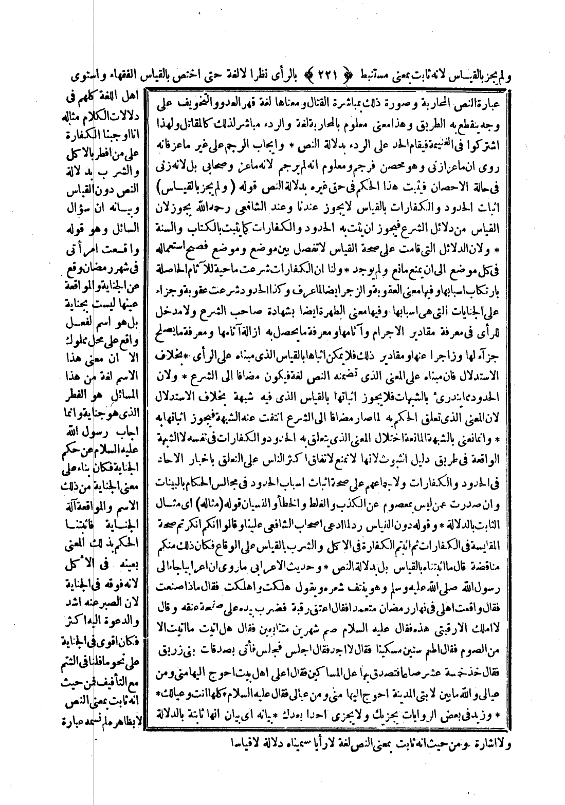 وَلَمْ يَجُزْ بِالْقِيَاسِ؛ لِأَنَّهُ ثَابِتٌ بِمَعْنًى مُسْتَنْبَطٍ بِالرَّأْيِ نَظَرًا لَا لُغَةً حَتَّى اخْتَصَّ بِالْقِيَاسِ الْفُقَهَاءُ وَاسْتَوَى أَهْلُ اللُّغَةِ كُلُّهُمْ فِي دَلَالَاتِ الْكَلَامِ مِثَالُهُ أَنَّا أَوْجَبْنَا الْكَفَّارَةَ عَلَى مَنْ أَفْطَرَ بِالْأَكْلِ وَالشُّرْبِ بِدَلَالَةِ النَّصِّ دُونَ الْقِيَاسِ، وَبَيَانُهُ أَنَّ سُؤَالَ السَّائِلِ وَهُوَ قَوْلُهُ وَاقَعْت امْرَأَتِي فِي شَهْرِ رَمَضَانَ وَقَعَ عَنْ الْجِنَايَةِ وَالْمُوَاقَعَةُ عَيْنُهَا لَيْسَتْ بِجِنَايَةٍ بَلْ هُوَ اسْمٌ لِفِعْلٍ وَاقِعٍ عَلَى مَحَلٍّ مَمْلُوكٍ، إلَّا أَنَّ مَعْنَى هَذَا الِاسْمِ لُغَةً مِنْ هَذَا الْمَسَائِلِ هُوَ الْفِطْرُ الَّذِي هُوَ جِنَايَةٌ وَإِنَّمَا أَجَابَ رَسُولُ اللَّهِ - عَلَيْهِ السَّلَامُ - عَنْ حُكْمِ الْجِنَايَةِ فَكَانَ بِنَاءً عَلَى مَعْنَى الْجِنَايَةِ مِنْ ذَلِكَ الِاسْمِ وَالْمُوَاقَعَةُ آلَةُ الْجِنَايَةِ فَأَثْبَتْنَا الْحُكْمَ بِذَلِكَ الْمَعْنَى بِعَيْنِهِ فِي الْأَكْلِ؛ لِأَنَّهُ فَوْقَهُ فِي الْجِنَايَةِ لِأَنَّ الصَّبْرَ عَنْهُ أَشَدُّ وَالدَّعْوَةُ إلَيْهِ أَكْثَرُ فَكَانَ أَقْوَى فِي الْجِنَايَةِ عَلَى نَحْوِ مَا قُلْنَا فِي الشَّتْمِ مَعَ التَّأْفِيفِ، فَمِنْ حَيْثُ إنَّهُ ثَابِتٌ بِمَعْنَى النَّصِّ لَا بِظَاهِرِهِ لَمْ نُسَمِّهِ عِبَارَةً وَلَا إشَارَةً وَمِنْ حَيْثُ إنَّهُ ثَابِتٌ بِمَعْنَى النَّصِّ لُغَةً لَا رَأْيًا سَمَّيْنَاهُ دَلَالَةً لَا قِيَاسًا