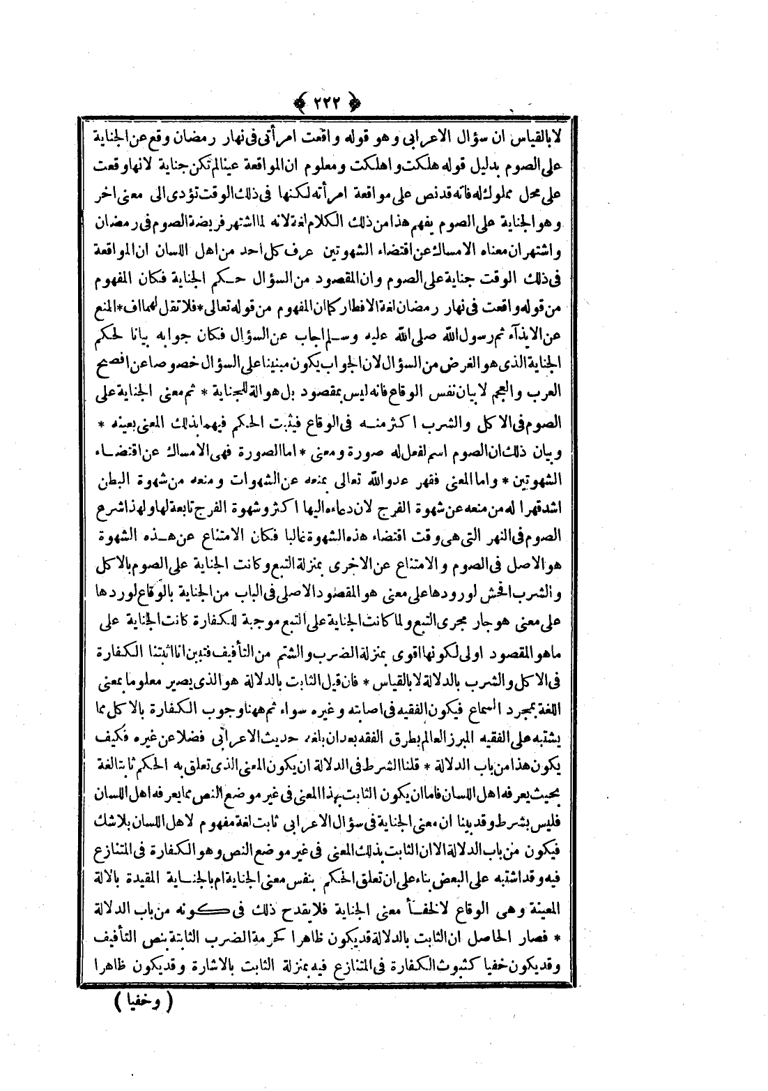 ـــــــــــــــــــــــــــــQلَا بِالْقِيَاسِ أَنَّ سُؤَالَ الْأَعْرَابِيِّ وَهُوَ قَوْلُهُ وَاقَعْت امْرَأَتِي فِي نَهَارِ رَمَضَانَ وَقَعَ عَنْ الْجِنَايَةِ عَلَى الصَّوْمِ بِدَلِيلِ قَوْلِهِ: هَلَكْت وَأَهْلَكْت، وَمَعْلُومٌ أَنَّ الْمُوَاقَعَةَ عَيْنًا لَمْ تَكُنْ جِنَايَةً؛ لِأَنَّهَا وَقَعَتْ عَلَى مَحَلٍّ مَمْلُوكٍ فَإِنَّهُ قَدْ نَصَّ عَلَى مُوَاقَعَةِ امْرَأَتِهِ لَكِنَّهَا فِي ذَلِكَ الْوَقْتِ تُؤَدِّي إلَى مَعْنًى آخَرَ وَهُوَ الْجِنَايَةُ عَلَى الصَّوْمِ يُفْهَمُ هَذَا مِنْ ذَلِكَ الْكَلَامِ لُغَةً؛ لِأَنَّهُ لَمَّا اُشْتُهِرَ فَرِيضَةُ الصَّوْمِ فِي رَمَضَانَ وَاشْتُهِرَ أَنَّ مَعْنَاهُ الْإِمْسَاكُ عَنْ اقْتِضَاءِ الشَّهْوَتَيْنِ عَرَفَ كُلِّ أَحَدٍ مِنْ أَهْلِ اللِّسَانِ أَنَّ الْمُوَاقَعَةَ فِي ذَلِكَ الْوَقْتِ جِنَايَةٌ عَلَى الصَّوْمِ وَأَنَّ الْمَقْصُودَ مِنْ السُّؤَالِ حُكْمُ الْجِنَايَةِ فَكَانَ الْمَفْهُومُ مِنْ قَوْلِهِ وَاقَعْت فِي نَهَارِ رَمَضَانَ لُغَةً الْإِفْطَارُ كَمَا أَنَّ الْمَفْهُومَ مِنْ قَوْله تَعَالَى {فَلا تَقُلْ لَهُمَا أُفٍّ} [الإسراء: 23] الْمَنْعُ عَنْ الْإِيذَاءِ، ثُمَّ رَسُولُ اللَّهِ - صَلَّى اللَّهُ عَلَيْهِ وَسَلَّمَ - أَجَابَ عَنْ السُّؤَالِ فَكَانَ جَوَابُهُ بَيَانًا لِحُكْمِ الْجِنَايَةِ الَّذِي هُوَ الْغَرَضُ مِنْ السُّؤَالِ؛ لِأَنَّ الْجَوَابَ يَكُونُ مَبْنِيًّا عَلَى السُّؤَالِ خُصُوصًا عَنْ أَفْصَحِ الْعَرَبِ وَالْعَجَمِ لَا بَيَانِ نَفْسِ الْوِقَاعِ فَإِنَّهُ لَيْسَ بِمَقْصُودٍ بَلْ هُوَ آلَةٌ لِلْجِنَايَةِ.