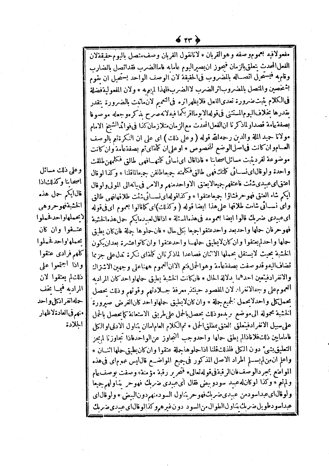 ـــــــــــــــــــــــــــــQمَفْعُولًا فِيهِ بِعُمُومِ وَصْفِهِ وَهُوَ الْقُرْبَانُ؛ لِأَنَّا نَقُولُ الْقُرْبَانُ وَصْفٌ مُتَّصِلٌ بِالْيَوْمِ حَقِيقَةً؛ لِأَنَّ الْفِعْلَ الْمُحْدَثَ يَتَعَلَّقُ بِالزَّمَانِ فَيَجُوزُ أَنْ يَصِيرَ الْيَوْمُ عَامًّا بِهِ فَأَمَّا الضَّرْبُ فَقَدْ اتَّصَلَ بِالضَّارِبِ وَقَامَ بِهِ فَيَسْتَحِيلُ اتِّصَالُهُ بِالْمَضْرُوبِ فِي الْحَقِيقَةِ؛ لِأَنَّ الْوَصْفَ الْوَاحِدَ يَسْتَحِيلُ أَنْ يَقُومَ بِشَخْصَيْنِ وَالْمُتَّصِلُ بِالْمَضْرُوبِ أَثَرُ الضَّرْبِ لَا الضَّرْبُ فَلِهَذَا لَمْ يَعُمَّ بِهِ. وَلِأَنَّ الْمَفْعُولِيَّةَ فَضْلَةٌ فِي الْكَلَامِ يَثْبُتُ ضَرُورَةَ تَعَدِّي الْفِعْلِ فَلَا يَظْهَرُ أَثَرُهُ فِي التَّعْمِيمِ؛ لِأَنَّ مَا ثَبَتَ بِالضَّرُورَةِ يَتَقَدَّرُ بِقَدْرِهَا بِخِلَافِ الْيَوْمِ الْمُسْتَثْنَى فِي قَوْلِهِ إلَّا يَوْمًا أَقْرَبُكُمَا فِيهِ؛ لِأَنَّهُ صَرَّحَ بِذَكَرِهِ وَجَعَلَهُ مَوْصُوفًا بِصِفَةٍ عَامَّةٍ قَصْدًا وَلَمَّا ذَكَرْنَا أَنَّ الْفِعْلَ الْمُحْدَثَ مَعَ الزَّمَانِ مُتَلَازِمَانِ كَذَا فِي فَوَائِدِ الشَّيْخِ الْإِمَامِ مَوْلَانَا حَمِيدِ الْمِلَّةِ وَالدِّينِ - رَحِمَهُ اللَّهُ -.