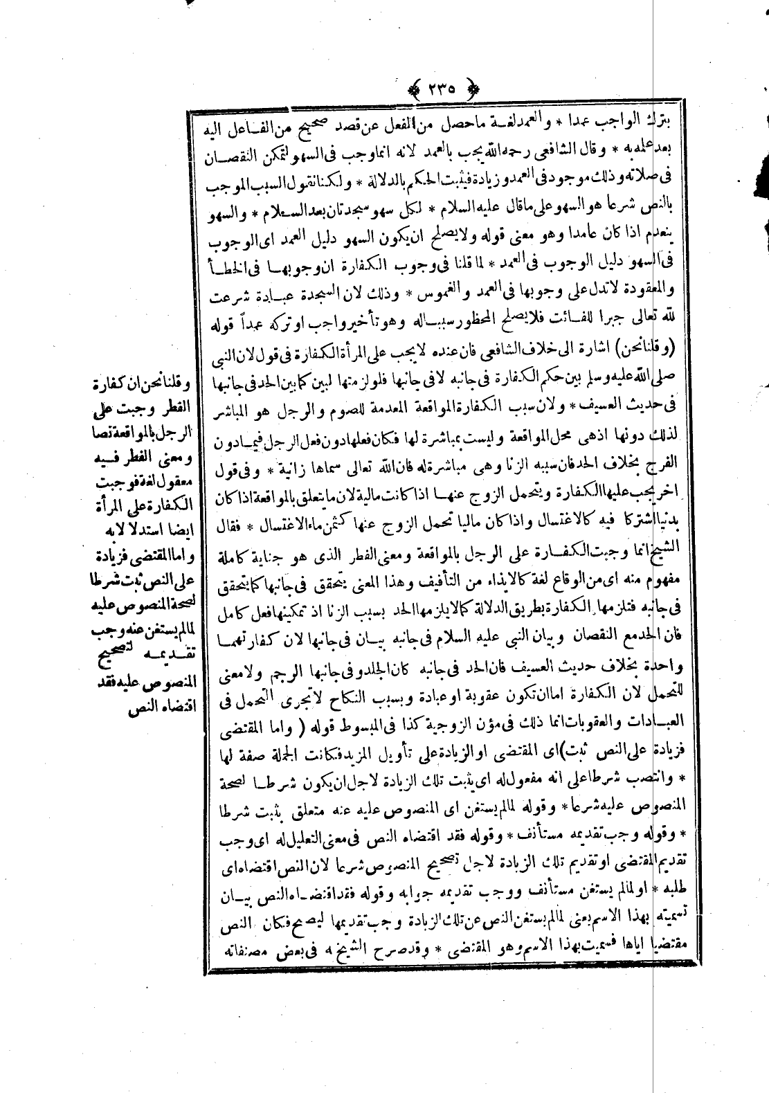 وَقَالَ الشَّافِعِيُّ - رَحِمَهُ اللَّهُ -: يَجِبُ بِالْعَمْدِ؛ لِأَنَّهُ إنَّمَا وَجَبَ فِي السَّهْوِ لِتَمَكُّنِ النُّقْصَانِ فِي صَلَاتِهِ وَذَلِكَ مَوْجُودٌ فِي الْعَمْدِ وَزِيَادَةٌ فَيَثْبُتُ الْحُكْمُ بِالدَّلَالَةِ. وَلَكِنَّا نَقُولُ السَّبَبُ الْمُوجِبُ بِالنَّصِّ شَرْعًا هُوَ السَّهْوُ عَلَى مَا قَالَ - عَلَيْهِ السَّلَامُ - لِكُلِّ سَهْوٍ سَجْدَتَانِ بَعْدَ السَّلَامِ وَالسَّهْوُ يَنْعَدِمُ إذَا كَانَ عَامِدًا وَهُوَ مَعْنَى قَوْلِهِ وَلَا يَصْلُحُ أَنْ يَكُونَ السَّهْوُ دَلِيلَ الْعَمْدِ أَيْ الْوُجُوبُ فِي السَّهْوِ دَلِيلَ الْوُجُوبِ فِي الْعَمْدِ؛ لِمَا قُلْنَا فِي وُجُوبِ الْكَفَّارَةِ أَنَّ وُجُوبَهَا فِي الْخَطَإِ وَالْمَعْقُودَةِ لَا تَدُلُّ عَلَى وُجُوبِهَا فِي الْعَمْدِ وَالْغَمُوسِ وَذَلِكَ لِأَنَّ السَّجْدَةَ عِبَادَةٌ شُرِعَتْ لِلَّهِ تَعَالَى جَبْرًا لِلْفَائِتِ فَلَا يَصْلُحُ الْمَحْظُورُ سَبَبًا لَهُ وَهُوَ تَأْخِيرُ وَاجِبٍ أَوْ تَرْكُهُ عَمْدًا قَوْلُهُ (وَقُلْنَا نَحْنُ) إشَارَةٌ إلَى خِلَافِ الشَّافِعِيِّ فَإِنَّ عِنْدَهُ لَا يَجِبُ عَلَى الْمَرْأَةِ الْكَفَّارَةُ فِي قَوْلٍ؛ لِأَنَّ النَّبِيَّ - صَلَّى اللَّهُ عَلَيْهِ وَسَلَّمَ - بَيَّنَ حُكْمَ الْكَفَّارَةِ فِي جَانِبِهِ لَا فِي جَانِبِهَا فَلَوْ لَزِمَتْهَا لَبَيَّنَ كَمَا بَيَّنَ الْحَدَّ فِي جَانِبِهَا فِي حَدِيثِ الْعَسِيفِ. وَلِأَنَّ سَبَبَ الْكَفَّارَةِ الْمُوَاقَعَةُ الْمُعْدِمَةُ لِلصَّوْمِ وَالرَّجُلُ هُوَ الْمُبَاشِرُ لِذَلِكَ دُونَهَا إذْ هِيَ مَحَلُّ الْمُوَاقَعَةِ وَلَيْسَتْ بِمُبَاشِرَةٍ لَهَا فَكَانَ فِعْلُهَا دُونَ فِعْلِ الرَّجُلِ فِيمَا دُونَ الْفَرْجِ بِخِلَافِ الْحَدِّ فَإِنَّ سَبَبَهُ الزِّنَا وَهِيَ مُبَاشِرَةٌ لَهُ فَإِنَّ اللَّهَ تَعَالَى سَمَّاهَا زَانِيَةً.
