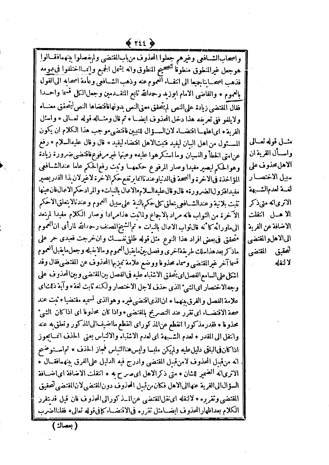 ـــــــــــــــــــــــــــــQوَأَصْحَابِ الشَّافِعِيِّ وَغَيْرِهِمْ جَعَلُوا الْمَحْذُوفَ مِنْ بَابِ الْمُقْتَضِي وَلَمْ يَفْصِلُوا بَيْنَهُمَا فَقَالُوا: هُوَ جَعْلُ غَيْرِ الْمَنْطُوقِ مَنْطُوقًا لِتَصْحِيحِ الْمَنْطُوقِ وَأَنَّهُ يَشْمَلُ الْجَمِيعَ وَإِنَّمَا اخْتَلَفُوا فِي عُمُومِهِ فَذَهَبَ أَصْحَابُنَا جَمِيعًا إلَى انْتِفَاءِ الْعُمُومِ عَنْهُ وَذَهَبَ الشَّافِعِيُّ وَعَامَّةُ أَصْحَابِهِ إلَى الْقَوْلِ بِالْعُمُومِ وَالْقَاضِي الْإِمَامُ أَبُو زَيْدٍ - رَحِمَهُ اللَّهُ - تَابَعَ الْمُتَقَدِّمِينَ وَجَعَلَ الْكُلَّ قِسْمًا وَاحِدًا فَقَالَ: الْمُقْتَضَى زِيَادَةٌ عَلَى النَّصِّ لَمْ يَتَحَقَّقْ مَعْنَى النَّصِّ بِدُونِهَا فَاقْتَضَاهَا النَّصُّ لِيَتَحَقَّقَ مَعْنَاهُ وَلَا يَلْغُو فَفِي تَعْرِيفِهِ هَذَا دَخَلَ الْمَحْذُوفُ أَيْضًا ثُمَّ قَالَ وَمِثَالُهُ قَوْله تَعَالَى {وَاسْأَلِ الْقَرْيَةَ} [يوسف: 82] أَيْ أَهْلَهَا اقْتِضَاءً لِأَنَّ السُّؤَالَ لِلتَّبْيِينِ فَاقْتَضَى مُوجِبُ هَذَا الْكَلَامِ أَنْ يَكُونَ الْمَسْئُولُ مِنْ أَهْلِ الْبَيَانِ لِيُفِيدَ فَثَبَتَ الْأَهْلُ اقْتِضَاءً لِيُفِيدَ قَالَ: وَقَالَ - عَلَيْهِ السَّلَامُ - «رُفِعَ عَنْ أُمَّتِي الْخَطَأُ وَالنِّسْيَانُ وَمَا اُسْتُكْرِهُوا عَلَيْهِ» وَعَيْنُهَا غَيْرُ مَرْفُوعٍ فَاقْتَضَى ضَرُورَةَ زِيَادَةٍ وَهُوَ الْحُكْمُ لِيَصِيرَ مُفِيدًا وَصَارَ الْمَرْفُوعُ حُكْمَهَا وَثَبَتَ رَفْعُ الْحُكْمِ عَامًّا عِنْدَ الشَّافِعِيِّ الْمُؤَاخَذَةُ فِي الْآخِرَةِ وَالصِّحَّةُ فِي الدُّنْيَا وَعِنْدَنَا إنَّمَا يَرْتَفِعُ حُكْمُ الْآخِرَةِ لَا غَيْرُ لِأَنَّ بِذَا الْقَدْرِ يَصِيرُ مُفِيدًا فَتَزُولُ الضَّرُورَةُ.
