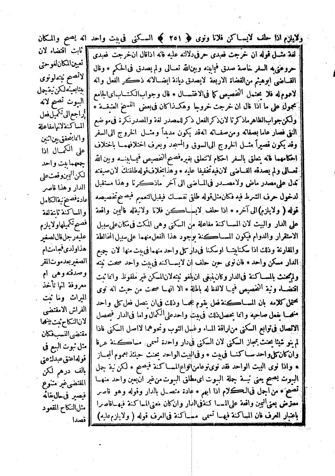 قَوْلُهُ (وَلَا يَلْزَمُ) إلَى آخِرِهِ إذَا حَلَفَ لَا يُسَاكِنُ فُلَانًا وَلَا نِيَّةَ لَهُ فَالْيَمِينُ وَاقِعَةٌ عَلَى الدَّارِ وَالْبَيْتِ لِأَنَّ الْمُسَاكَنَةَ مُفَاعَلَةٌ مِنْ السُّكْنَى وَهِيَ الْمُكْثُ فِي مَكَان عَلَى سَبِيلِ الِاسْتِقْرَارِ وَالدَّوَامِ فَيَكُونُ الْمُسَاكَنَةُ بِوُجُودِ هَذَا الْفِعْلِ مِنْهُمَا عَلَى سَبِيلِ الْمُخَالَطَةِ وَالْمُقَارَنَةِ وَذَلِكَ إذَا سَكَنَا بَيْتًا أَوْ سَكَنَا فِي دَارِ كُلِّ وَاحِدٍ مِنْهُمَا فِي بَيْتٍ مِنْهَا لِأَنَّ جَمِيعَ الدَّارِ مَسْكَنٌ وَاحِدٌ فَإِنْ نَوَى حِينَ حَلَفَ أَنْ لَا يُسَاكِنَهُ فِي بَيْتٍ وَاحِدٍ صَحَّتْ نِيَّتُهُ وَلَمْ يَحْنَثْ بِالْمُسَاكَنَةِ فِي الدَّارِ وَكَانَ يَنْبَغِي أَنْ يَلْغُوَ نِيَّتَهُ لِأَنَّ الْمَسْكَنَ غَيْرُ مَلْفُوظٍ وَإِنَّمَا ثَبَتَ اقْتِضَاءً وَنِيَّةُ التَّخْصِيصِ فِيمَا لَا لَفْظَ لَهُ بَاطِلَةٌ إلَّا أَنَّهَا صَحَّتْ مِنْ حَيْثُ إنَّهُ نَوَى مُحْتَمَلَ كَلَامِهِ بِأَنَّ الْمُسَاكَنَةَ فِعْلٌ يَقُومُ بِهِمَا وَذَلِكَ فِي أَنْ يَتَّصِلَ فِعْلُ كُلِّ وَاحِدٍ مِنْهُمَا بِفِعْلِ صَاحِبِهِ وَإِنَّمَا يَحْصُلُ ذَلِكَ فِي بَيْتٍ وَاحِدٍ عَلَى الْكَمَالِ وَأَمَّا فِي الدَّارِ فَيَحْصُلُ الِاتِّصَالُ فِي تَوَابِعِ السُّكْنَى مِنْ إرَاقَةِ الْمَاءِ وَغُسْلِ الثَّوْبِ وَنَحْوِهِمَا لَا أَصْلِ السُّكْنَى فَإِذَا لَمْ يَنْوِ شَيْئًا يَحْنَثُ بِمَجَازِ السُّكْنَى لِأَنَّ السُّكْنَى فِي دَارٍ وَاحِدَةٍ تُسَمَّى مُسَاكَنَةً عُرْفًا وَإِنْ كَانَ كُلُّ وَاحِدٍ سَاكِنًا فِي بَيْتٍ وَفِي الْبَيْتِ الْوَاحِدِ يَحْنَثُ حِينَئِذٍ بِعُمُومِ الْمَجَازِ وَإِذَا نَوَى الْبَيْتَ الْوَاحِدَ فَقَدْ نَوَى نَوْعًا مِنْ أَنْوَاعِ الْمُسَاكَنَةِ فَيَصِحُّ لَكِنَّ نِيَّةَ جَمْلِ الْبُيُوتِ يَصِحُّ يَعْنِي نِيَّةَ جُمْلَةِ الْبُيُوتِ أَيْ مُطْلَقِ الْبُيُوتِ مِنْ غَيْرِ أَنْ يُعَيَّنَ وَاحِدٌ مِنْهَا تَصِحُّ مَنْ أَجْمَلَ فِي الْكَلَامِ إذَا أَبْهَمَ عَادَةً مُتَّصِلٌ بِالدَّارِ وَقَوْلُهُ وَهُوَ قَاصِرٌ مُعْتَرَضٌ يَعْنِي الْيَمِينَ وَاقِعَةً عَلَى الْمُسَاكَنَةِ فِي الدَّارِ وَإِنْ كَانَ مَعْنَى الْمُسَاكَنَةِ فِيهَا قَاصِرًا بِاعْتِبَارِ الْعُرْفِ فَإِنَّ الْمُسَاكَنَةَ فِيهَا تُسَمَّى مُسَاكَنَةً فِي الْعُرْفِ.