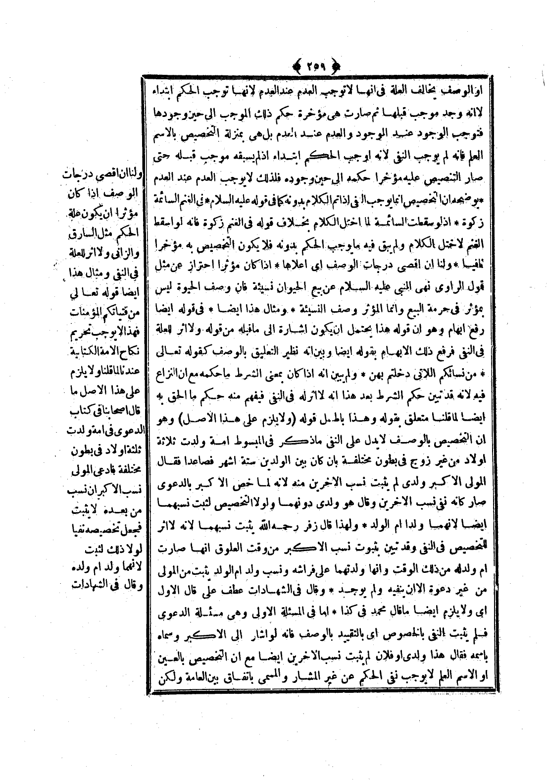 وَلَنَا أَنَّ أَقْصَى دَرَجَاتِ الْوَصْفِ إذَا كَانَ مُوَثِّرًا أَنْ يَكُونَ عِلَّةُ الْحُكْمِ مِثْلَ السَّارِقِ وَالزَّانِي وَلَا أَثَرَ لِلْعِلَّةِ فِي النَّفْيِ وَمِثَالُ هَذَا أَيْضًا قَوْله تَعَالَى {مِنْ فَتَيَاتِكُمُ الْمُؤْمِنَاتِ} [النساء: 25] فَهَذَا لَا يُوجِبُ تَحْرِيمَ نِكَاحِ الْأَمَةِ الْكِتَابِيَّةِ عِنْدَنَا لِمَا قُلْنَا وَلَا يَلْزَمُ عَلَى هَذَا الْأَصْلِ مَا قَالَ أَصْحَابُنَا فِي كِتَابِ الدَّعْوَى فِي أَمَةٍ وَلَدَتْ ثَلَاثَةَ أَوْلَادٍ فِي بُطُونٍ مُخْتَلِفَةٍ فَادَّعَى الْمَوْلَى نَسَبَ الْأَكْبَرِ أَنَّ نَسَبَ مَنْ بَعْدَهُ لَا يَثْبُتُ فَجَعَلَ تَخْصِيصَهُ نَفْيًا لَوْلَا ذَلِكَ لَثَبَتَ لِأَنَّهُمَا وَلَدُ أُمِّ وَلَدِهِ وَقَالَ فِي الشَّهَادَاتِ