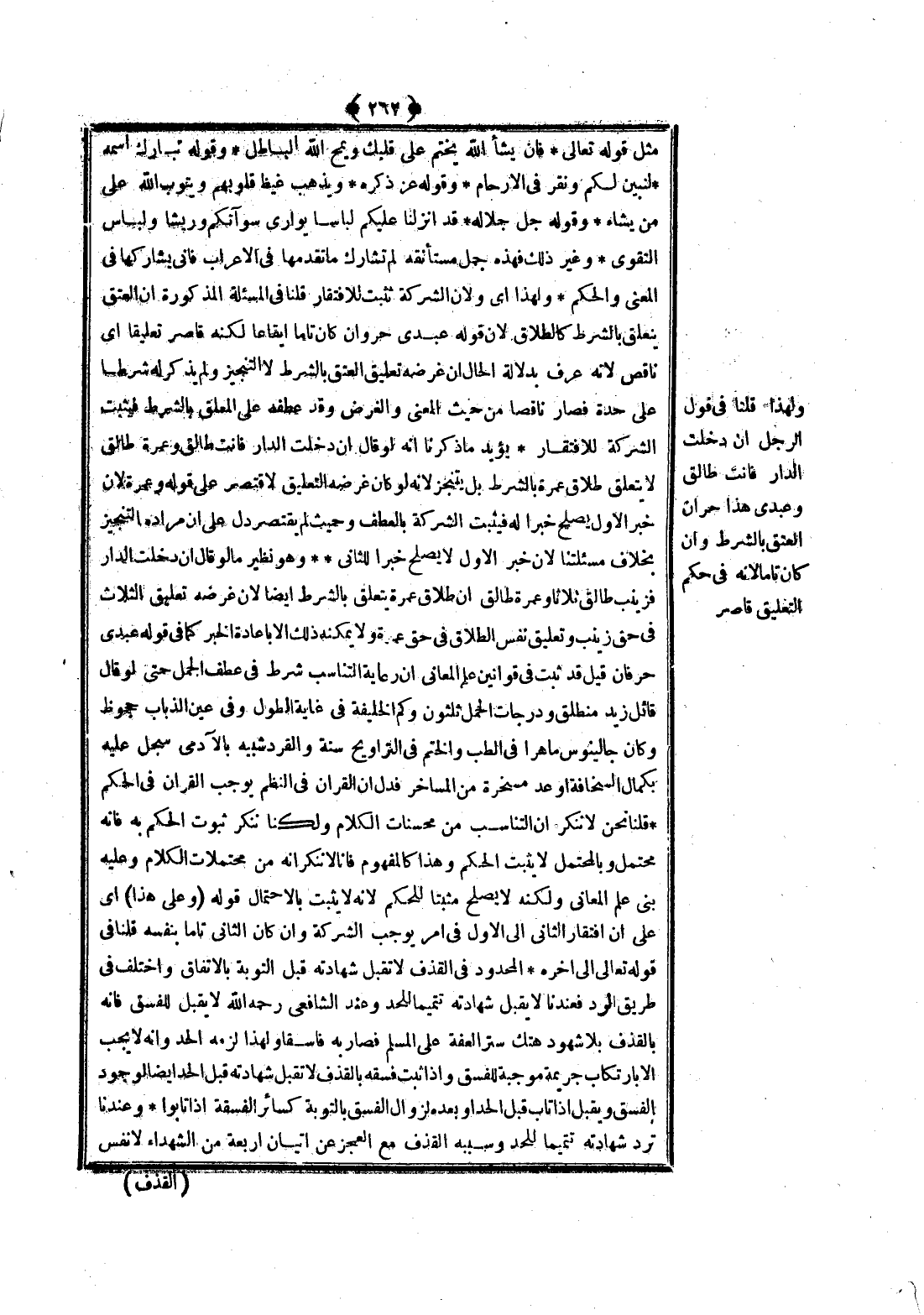 وَقَوْلُهُ تَبَارَكَ اسْمُهُ {لِنُبَيِّنَ لَكُمْ وَنُقِرُّ فِي الأَرْحَامِ} [الحج: 5] وَقَوْلُهُ عَزَّ ذِكْرُهُ {وَيُذْهِبْ غَيْظَ قُلُوبِهِمْ وَيَتُوبُ اللَّهُ عَلَى مَنْ يَشَاءُ} [التوبة: 15] وَقَوْلُهُ جَلَّ جَلَالُهُ {قَدْ أَنْزَلْنَا عَلَيْكُمْ لِبَاسًا يُوَارِي سَوْآتِكُمْ وَرِيشًا وَلِبَاسُ التَّقْوَى} [الأعراف: 26] وَغَيْرُ ذَلِكَ فَهَذِهِ جُمَلٌ مُسْتَأْنَفَةٌ لَمْ تُشَارِكْ مَا تَقَدَّمَهَا فِي الْإِعْرَابِ فَأَنَّى تُشَارِكُهَا فِي الْمَعْنَى وَالْحُكْمِ وَلِهَذَا أَيْ وَلِأَنَّ الشَّرِكَةَ تَثْبُتُ لِلِافْتِقَارِ قُلْنَا فِي الْمَسْأَلَةِ الْمَذْكُورَةِ إنَّ الْعِتْقَ يَتَعَلَّقُ بِالشَّرْطِ كَالطَّلَاقِ لِأَنَّ قَوْلَهُ عَبْدِي حُرٌّ وَإِنْ كَانَ تَامًّا إيقَاعًا لَكِنَّهُ قَاصِرٌ تَعْلِيقًا أَيْ نَاقِصٌ لِأَنَّهُ عُرِفَ بِدَلَالَةِ الْحَالِ أَنَّ غَرَضَهُ تَعْلِيقُ الْعِتْقِ بِالشَّرْطِ لَا التَّنْجِيزُ وَلَمْ يُذْكَرْ لَهُ شَرْطًا عَلَى حِدَةٍ فَصَارَ نَاقِصًا مِنْ حَيْثُ الْمَعْنَى وَالْغَرَضُ وَقَدْ عَطَفَهُ عَلَى الْمُعَلَّقِ بِالشَّرْطِ فَيَثْبُتُ الشَّرِكَةُ لِلِافْتِقَارِ يُؤَيِّدُ مَا ذَكَرْنَا أَنَّهُ لَوْ قَالَ: إنْ دَخَلْت الدَّارَ فَأَنْتِ طَالِقٌ وَعَمْرَةُ طَالِقٌ لَا يَتَعَلَّقُ طَلَاقُ عَمْرَةَ بِالشَّرْطِ بَلْ يُتَنَجَّزُ لِأَنَّهُ لَوْ كَانَ غَرَضُهُ التَّعْلِيقَ لَاقْتَصَرَ عَلَى قَوْلِهِ وَعَمْرَةُ لِأَنَّ خَبَرَ الْأَوَّلِ يَصْلُحُ خَبَرًا لَهُ فَيَثْبُتُ الشَّرِكَةُ بِالْعَطْفِ وَحَيْثُ لَمْ يَقْتَصِرْ دَلَّ عَلَى أَنَّ مُرَادَهُ التَّنْجِيزُ بِخِلَافِ مَسْأَلَتِنَا لِأَنَّ خَبَرَ الْأَوَّلِ لَا يَصْلُحُ خَبَرًا لِلثَّانِي وَهُوَ نَظِيرُ مَا لَوْ قَالَ: إنْ دَخَلْت الدَّارَ فَزَيْنَبُ طَالِقٌ ثَلَاثًا وَعَمْرَةُ طَالِقٌ أَنَّ طَلَاقَ عَمْرَةَ يَتَعَلَّقُ بِالشَّرْطِ أَيْضًا لِأَنَّ غَرَضَهُ تَعْلِيقُ الثَّلَاثِ فِي حَقِّ زَيْنَبَ وَتَعْلِيقُ نَفْسِ الطَّلَاقِ فِي حَقِّ عَمْرَةَ وَلَا يُمْكِنُهُ ذَلِكَ إلَّا بِإِعَادَةِ الْخَبَرِ كَمَا فِي قَوْلِهِ عَبْدِي حُرٌّ فَإِنْ قِيلَ: قَدْ ثَبَتَ فِي قَوَانِينِ عِلْمِ الْمَعَانِي أَنَّ رِعَايَةَ التَّنَاسُبِ شَرْطٌ فِي عَطْفِ الْجُمَلِ حَتَّى لَوْ قَالَ قَائِلٌ: زَيْدٌ مُنْطَلِقٌ وَدَرَجَاتُ الْحَمْلِ ثَلَثُونِ وَكُمُّ الْخَلِيفَةِ فِي غَايَةِ الطُّولِ وَفِي عَيْنِ الذُّبَابِ جُحُوظٌ وَكَانَ جَالِينُوسُ مَاهِرًا فِي الطِّبِّ وَالْخَتْمُ فِي التَّرَاوِيحِ سُنَّةٌ وَالْقِرْدُ شَبِيهٌ بِالْآدَمِيِّ سُجِّلَ عَلَيْهِ بِكَمَالِ السَّخَافَةِ أَوْ عُدَّ مَسْخَرَةً مِنْ الْمَسَاخِرِ فَدَلَّ أَنَّ الْقِرَانَ فِي النَّظْمِ يُوجِبُ الْقِرَانَ فِي الْحُكْمِ.