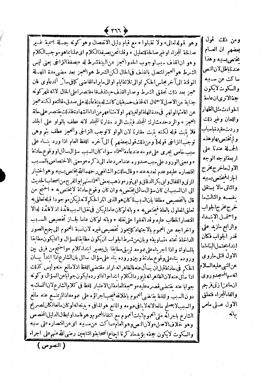 وَمِنْ ذَلِكَ قَوْلُ بَعْضِهِمْ إنَّ الْعَامَّ يَخْتَصُّ بِسَبَبِهِ وَهَذَا عِنْدَنَا بَاطِلٌ لِأَنَّ النَّصَّ سَاكِتٌ عَنْ سَبَبِهِ وَالسُّكُوتَ لَا يَكُونُ حُجَّةً أَلَا تَرَى أَنَّ عَامَّةَ الْحَوَادِثِ مِثْلُ الظِّهَارِ وَاللِّعَانِ وَغَيْرِ ذَلِكَ وَرَدَتْ مُقَيَّدَةً بِأَسْبَابٍ وَلَمْ تَخْتَصَّ بِهَا وَهَذِهِ الْجُمْلَةُ عِنْدَنَا عَلَى أَرْبَعَةِ أَوْجُهٍ الْوَجْهُ الْأَوَّلُ مَا خَرَجَ مَخْرَجَ الْجَزَاءِ فَيَخْتَصُّ بِسَبَبِهِ وَالثَّانِي مَا لَا يَسْتَقِلُّ بِنَفْسِهِ وَالثَّالِثُ مَا خَرَجَ مَخْرَجَ الْجَوَابِ وَاحْتَمَلَ الِابْتِدَاءَ وَالرَّابِعُ مَا زِيدَ عَلَى قَدْرِ الْجَوَابِ فَكَانَ ابْتِدَاءً يَحْتَمِلُ الْبِنَاءَ أَمَّا الْأَوَّلُ فَمِثْلُ مَا رُوِيَ «عَنْ النَّبِيِّ - عَلَيْهِ السَّلَامُ - أَنَّهُ سَهَا فَسَجَدَ» وَرُوِيَ أَنَّ مَاعِزًا زَنَى فَرُجِمَ وَالْفَاءُ لِلْجَزَاءِ فَتَعَلَّقَ الْأَوَّلُ عَلَى مَا مَرَّ بَيَانُهُ
