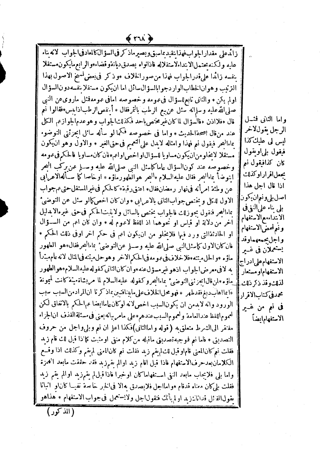 ـــــــــــــــــــــــــــــQزَائِدٍ عَلَى مِقْدَارِ الْجَوَابِ فَهَذَا يَتَقَيَّدُ بِمَا سَبَقَ وَيَصِيرُ مَا ذَكَرَ فِي السُّؤَالِ كَالْمُعَادِ فِي الْجَوَابِ لِأَنَّهُ بِنَاءٌ عَلَيْهِ وَلَكِنَّهُ يَحْتَمِلُ الِابْتِدَاءَ لِاسْتِقْلَالِهِ فَإِذَا نَوَاهُ يُصَدَّقُ دِيَانَةً وَقَضَاءً وَالرَّابِعُ مَا يَكُونُ مُسْتَقِلًّا بِنَفْسِهِ زَائِدًا عَلَى قَدْرِ الْجَوَابِ فَهَذَا مِنْ صُوَرِ الْخِلَافِ وَذُكِرَ فِي بَعْضِ نُسَخِ الْأُصُولِ بِهَذَا التَّرْتِيبِ وَهُوَ أَنَّ الْخِطَابَ الْوَارِدَ جَوَابًا لِسُؤَالِ سَائِلٍ إمَّا أَنْ يَكُونَ مُسْتَقِلًّا بِنَفْسِهِ دُونَ السُّؤَالِ أَوْ لَمْ يَكُنْ وَالثَّانِي تَابِعٌ لِلسُّؤَالِ فِي عُمُومِهِ وَخُصُوصِهِ أَمَّا فِي عُمُومِهِ فَمِثْلُ مَا رُوِيَ «عَنْ النَّبِيِّ - صَلَّى اللَّهُ عَلَيْهِ وَسَلَّمَ - أَنَّهُ سُئِلَ عَنْ بَيْعِ الرُّطَبِ بِالتَّمْرِ فَقَالَ أَيَنْقُصُ الرُّطَبُ إذَا يَبِسَ فَقَالُوا نَعَمْ قَالَ فَلَا إذَنْ» فَالسُّؤَالُ لَمَّا كَانَ غَيْرَ مُخْتَصٍّ بِأَحَدٍ فَكَذَلِكَ الْجَوَابُ وَهُوَ عَدَمُ الْجَوَازِ عَمَّ الْكُلَّ عِنْدَ مَنْ قَالَ بِصِحَّةِ الْحَدِيثِ وَأَمَّا فِي خُصُوصِهِ فَكَمَا لَوْ سَأَلَهُ سَائِلٌ أَيُجْزِئُنِي التَّوَضُّؤُ بِمَاءِ الْبَحْرِ؟ فَيَقُولُ: نَعَمْ فَهَذَا وَأَمْثَالُهُ لَا يَدُلُّ عَلَى التَّعْمِيمِ فِي حَقِّ الْغَيْرِ.
