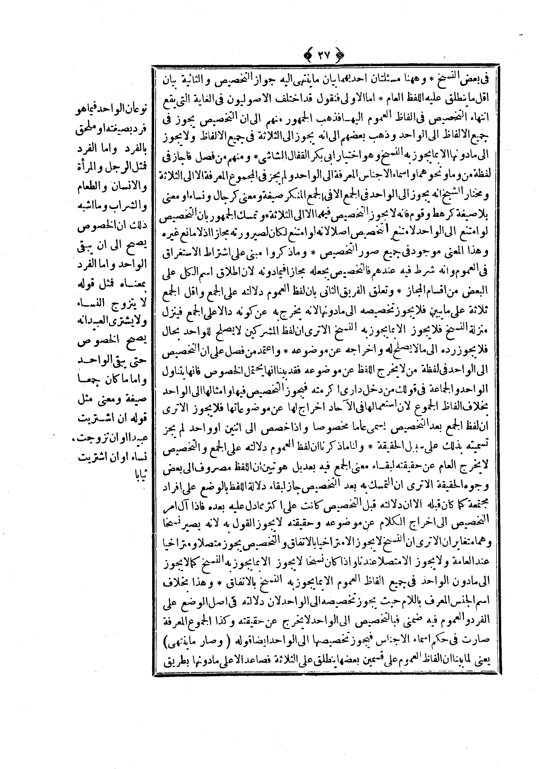 نَوْعَانِ الْوَاحِدُ فِيمَا هُوَ فَرْدٌ بِصِيغَتِهِ أَوْ مُلْحَقٌ بِالْفَرْدِ وَأَمَّا الْفَرْدُ فَمِثْلُ الرَّجُلِ وَالْمَرْأَةِ وَالْإِنْسَانِ وَالطَّعَامِ وَالشَّرَابِ وَمَا أَشْبَهَ ذَلِكَ إنَّ الْخُصُوصَ يَصِحُّ إلَى أَنْ يُبْقِيَ الْوَاحِدَ وَأَمَّا الْفَرْدُ بِمَعْنَاهُ فَمِثْلُ قَوْلِهِ لَا يَتَزَوَّجُ النِّسَاءَ وَلَا يَشْتَرِي الْعَبِيدَ أَنَّهُ يَصِحُّ الْخُصُوصُ حَتَّى يَبْقَى الْوَاحِدُ وَأَمَّا مَا كَانَ جَمْعًا صِيغَةً وَمَعْنًى مِثْلُ قَوْلِهِ إنْ اشْتَرَيْت عَبِيدًا أَوْ إنْ تَزَوَّجْت نِسَاءً أَوْ إنْ اشْتَرَيْت ثِيَابًا