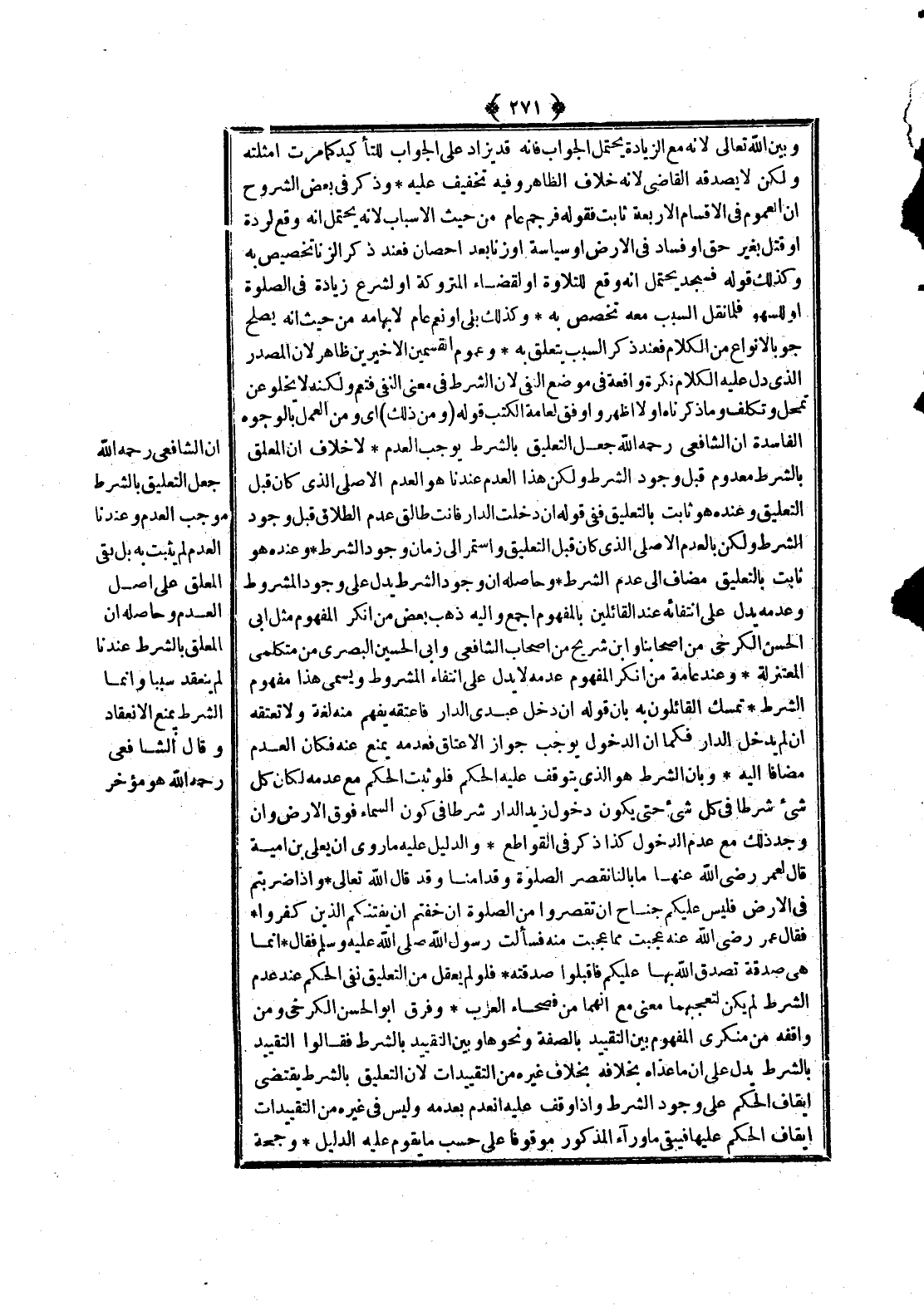 أَنَّ الشَّافِعِيَّ - رَحِمَهُ اللَّهُ - جَعَلَ التَّعْلِيقَ بِالشَّرْطِ مُوجِبٌ الْعَدَمَ وَعِنْدَنَا الْعَدَمُ لَمْ يَثْبُتْ بِهِ بَلْ بَقِيَ الْمُعَلَّقُ عَلَى أَصْلِ الْعَدَمِ وَحَاصِلُهُ أَنَّ الْمُعَلَّقَ بِالشَّرْطِ عِنْدَنَا لَمْ يَنْعَقِدْ سَبَبًا وَإِنَّمَا الشَّرْطُ يَمْنَعُ الِانْعِقَادَ وَقَالَ الشَّافِعِيُّ - رَحِمَهُ اللَّهُ -: هُوَ مُؤَخَّرٌ