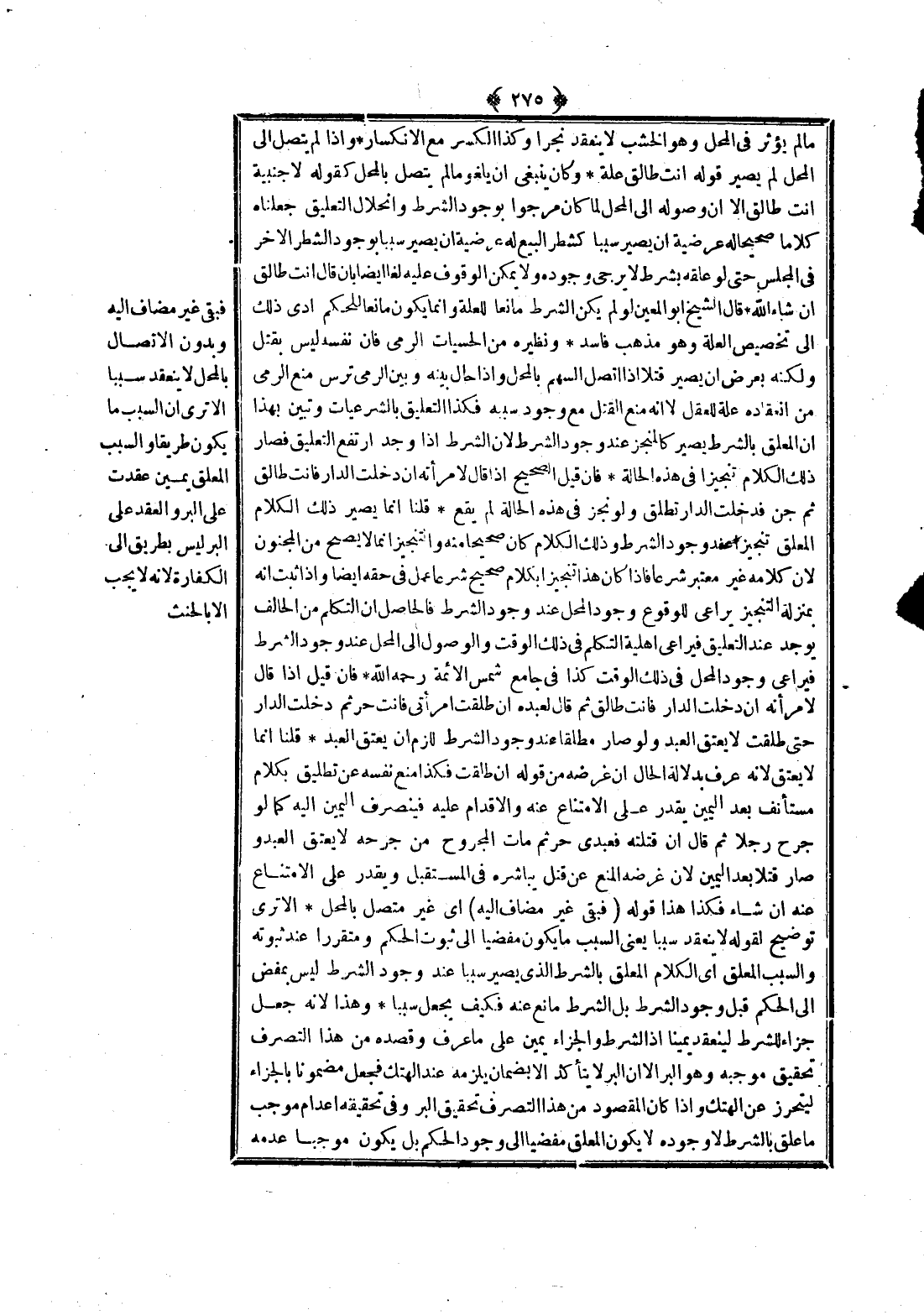 وَكَذَا الْكَسْرُ مَعَ الِانْكِسَارِ وَإِذَا لَمْ يَتَّصِلْ إلَى الْمَحَلِّ لَمْ يَصِرْ قَوْلُهُ أَنْتِ طَالِقٌ عِلَّةً وَكَانَ يَنْبَغِي أَنْ يَلْغُوَ مَا لَمْ يَتَّصِلْ بِالْمَحَلِّ كَقَوْلِهِ لِأَجْنَبِيَّةٍ أَنْتِ طَالِقٌ إلَّا أَنَّ وُصُولَهُ إلَى الْمَحَلِّ لَمَّا كَانَ مَرْجُوًّا بِوُجُودِ الشَّرْطِ وَانْحِلَالِ التَّعْلِيقِ جَعَلْنَاهُ كَلَامًا صَحِيحًا لَهُ عَرَضِيَّةٌ أَنْ يَصِيرَ سَبَبًا كَشَطْرِ الْبَيْعِ لَهُ عَرَضِيَّةٌ أَنْ يَصِيرَ سَبَبًا بِوُجُودِ الشَّطْرِ الْآخَرِ فِي الْمَجْلِسِ حَتَّى لَوْ عَلَّقَهُ بِشَرْطٍ لَا يُرْجَى وُجُودُهُ وَلَا يُمْكِنُ الْوُقُوفُ عَلَيْهِ لَغَا أَيْضًا بِأَنْ قَالَ: أَنْتِ طَالِقٌ إنْ شَاءَ اللَّهُ قَالَ الشَّيْخُ أَبُو الْمُعِينِ: لَوْ لَمْ يَكُنْ الشَّرْطُ مَانِعًا لِلْعِلَّةِ وَإِنَّمَا يَكُونُ مَانِعًا لِلْحُكْمِ أَدَّى ذَلِكَ إلَى تَخْصِيصِ الْعِلَّةِ وَهُوَ مَذْهَبٌ فَاسِدٌ وَنَظِيرُهُ مِنْ الْحِسِّيَّاتِ الرَّمْيُ فَإِنَّ نَفْسَهُ لَيْسَ بِقَتْلٍ وَلَكِنَّهُ بِعَرَضٍ أَنْ يَصِيرَ قَتْلًا إذَا اتَّصَلَ السَّهْمُ بِالْمَحَلِّ وَإِذَا حَالَ بَيْنَهُ وَبَيْنَ الرَّمْيِ تُرْسٌ مَنَعَ الرَّمْيُ مِنْ انْعِقَادِهِ عِلَّةً لِلْعَقْلِ لَا أَنَّهُ مَنَعَ الْقَتْلَ مَعَ وُجُودِ سَبَبِهِ فَكَذَا التَّعْلِيقُ بِالشَّرْعِيَّاتِ وَتَبَيَّنَ بِهَذَا أَنَّ الْمُعَلَّقَ بِالشَّرْطِ يَصِيرُ كَالْمُنْجَزِ عِنْدَ وُجُودِ الشَّرْطِ لِأَنَّ الشَّرْطَ إذَا وُجِدَ ارْتَفَعَ التَّعْلِيقُ فَصَارَ ذَلِكَ الْكَلَامُ تَنْجِيزًا فِي هَذِهِ الْحَالَةِ فَإِنْ قِيلَ: الصَّحِيحُ إذَا قَالَ لِامْرَأَتِهِ إنْ دَخَلْت الدَّارَ فَأَنْتِ طَالِقٌ ثُمَّ جُنَّ فَدَخَلَتْ الدَّارَ تَطْلُقُ وَلَوْ نَجَزَ فِي هَذِهِ الْحَالَةِ لَمْ يَقَعْ.
