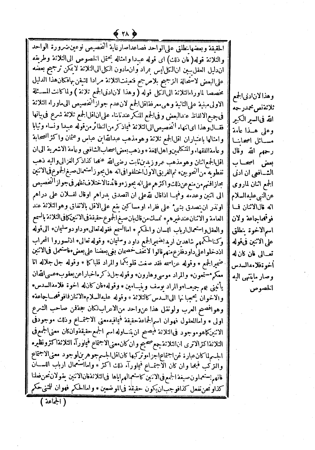ـــــــــــــــــــــــــــــQالْحَقِيقَةِ وَبَعْضُهَا يَنْطَلِقُ عَلَى الْوَاحِدِ فَصَاعِدًا صَارَ غَايَةُ التَّخْصِيصِ نَوْعَيْنِ ضَرُورَةُ الْوَاحِدِ وَالثَّلَاثَةِ.