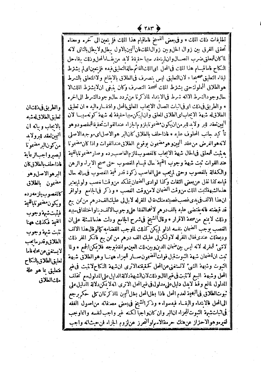 وَالطَّرِيقُ فِي ذَلِكَ أَنَّ تَعْلِيقَ الطَّلَاقِ لَهُ شَبَهٌ بِالْإِيجَابِ وَبَيَانُهُ أَنَّ الْيَمِينَ تُعْقَدُ لِلْبِرِّ وَلَا بُدَّ مِنْ كَوْنِ الْبِرِّ مَضْمُونًا لِيَصِيرَ وَاجِبَ الرِّعَايَةِ فَإِذَا حَلَفَ بِالطَّلَاقِ كَانَ الْبِرُّ هُوَ الْأَصْلُ وَهُوَ مَضْمُونٌ بِالطَّلَاقِ كَالْمَغْصُوبِ يَلْزَمُهُ رَدُّهُ وَيَكُونُ مَضْمُونًا بِالْقِيمَةِ فَيَثْبُتُ شُبْهَةُ وُجُوبِ الْقِيمَةِ فَكَذَلِكَ هَهُنَا تَثْبُتُ شُبْهَةُ وُجُوبِ الطَّلَاقِ وَقَدْرُ مَا يَجِبُ لَا يُسْتَغْنَى عَنْ مَحَلِّهِ فَأَمَّا تَعْلِيقُ الطَّلَاقِ بِالنِّكَاحِ فَتَعْلِيقٌ بِمَا هُوَ عِلَّةُ مِلْكِ الطَّلَاقِ