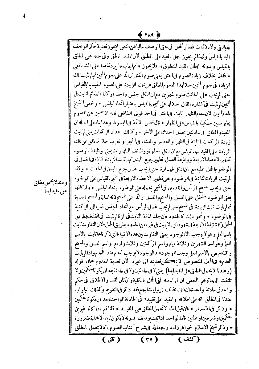 وَذُكِرَ فِي الْأَسْرَارِ فَإِنْ قِيلَ: إنَّك لَا تَحْمِلُ الْمُطْلَقَ عَلَى الْمُقَيَّدِ قُلْنَا: نَعَمْ إذَا كَانَا غَيْرَيْنِ حُكْمَيْنِ أَوْ شَرْطَيْنِ أَوْ عِلَّتَيْنِ فَأَمَّا الْوَاحِدُ إذَا ثَبَتَ بِوَصْفٍ فَدُونَهُ لَا يَكُونُ ثَابِتًا لَا مَحَالَةَ ضَرُورَةً وَذَكَرَ شَيْخُ الْإِسْلَامِ خُوَاهَرْ زَادَهْ - رَحِمَهُ اللَّهُ - فِي شَرْحِ كِتَابِ الصَّوْمِ إنَّمَا لَا يُحْمَلُ الْمُطْلَقُ