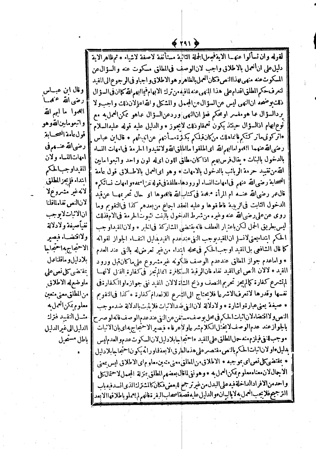 وَقَالَ ابْنُ عَبَّاسٍ - رَضِيَ اللَّهُ عَنْهُمَا - أَبْهِمُوا مَا أَبْهَمَ اللَّهُ وَاتَّبِعُوا مَا بَيَّنَ اللَّهُ وَهُوَ قَوْلُ عَامَّةِ الصَّحَابَةِ - رَضِيَ اللَّهُ عَنْهُمْ - فِي أُمَّهَاتِ النِّسَاءِ وَلِأَنَّ الْمُقَيَّدَ أَوْجَبَ الْحُكْمَ ابْتِدَاءً فَلَمْ يَجُزْ الْمُطْلَقُ لِأَنَّهُ غَيْرُ مَشْرُوعٍ لَا لِأَنَّ النَّصَّ نَفَاهُ لِمَا قُلْنَا: إنَّ الْإِثْبَاتَ لَا يُوجِبُ نَفْيًا صِيغَةً وَلَا دَلَالَةً وَلَا اقْتِضَاءً فَيَصِيرُ الِاحْتِجَاجُ بِهِ احْتِجَاجًا بِلَا دَلِيلٍ وَمَا قُلْنَا عَمَلٌ بِمُقْتَضَى كُلِّ نَصٍّ عَلَى مَا وُضِعَ لَهُ الْإِطْلَاقُ مِنْ الْمُطْلِقِ مَعْنَى مُتَعَيِّنٌ مَعْلُومٌ وَيُمْكِنُ الْعَمَلُ بِهِ مِثْلُ التَّقْيِيدِ فَتَرْكُ الدَّلِيلِ إلَى غَيْرِ الدَّلِيلِ بَاطِلٌ مُسْتَحِيلٌ