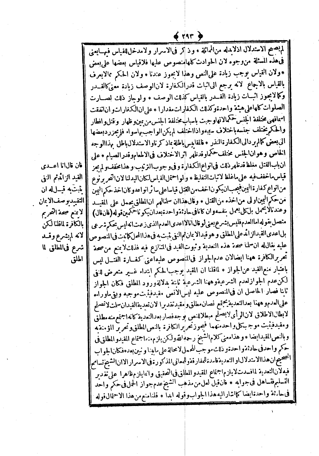وَهَذَا مَعْنَى كَلَامِ الشَّيْخِ - رَحِمَهُ اللَّهُ - وَلَكِنْ يَلْزَمُ مِنْهُ اجْتِمَاعُ الْمُقَيَّدِ وَالْمُطْلَقِ فِي حُكْمٍ وَاحِدٍ فِي حَادِثَةٍ وَاحِدَةٍ وَذَلِكَ مُوجِبٌ لِلْحَمْلِ لَا مَحَالَةَ عَلَى مَا بَيَّنَّا وَنُبَيِّنُ بَعْدُ فَكَانَ الْجَوَابُ الصَّحِيحُ أَنَّ هَذَا الِاسْتِدْلَالَ وَالتَّعْدِيَةَ فَاسِدَةٌ لِلْمُفَارَقَةِ وَلِلْمَعَانِي الْمَذْكُورَةِ فِي الْأَسْرَارِ إلَّا أَنَّ الشَّيْخَ تَسَامَحَ فِيهِ لِأَنَّ التَّعْدِيَةَ لَمَّا فَسَدَتْ لَا يَلْزَمُ اجْتِمَاعُ الْمُقَيَّدِ وَالْمُطْلَقِ فِي التَّحْقِيقِ وَإِنَّمَا يَلْزَمُ ظَاهِرًا عَلَى تَقْدِيرِ التَّسْلِيمِ فَتَسَاهَلَ فِي جَوَابِهِ فَإِنْ قِيلَ لَعَلَّ مِنْ مَذْهَبِ الشَّيْخِ عَدَمَ جَوَازِ الْحَمْلِ فِي حُكْمٍ وَاحِدٍ فِي حَادِثَةٍ وَاحِدَةٍ أَيْضًا كَمَا أَشَارَ إلَيْهِ هَذَا الْجَوَابُ.