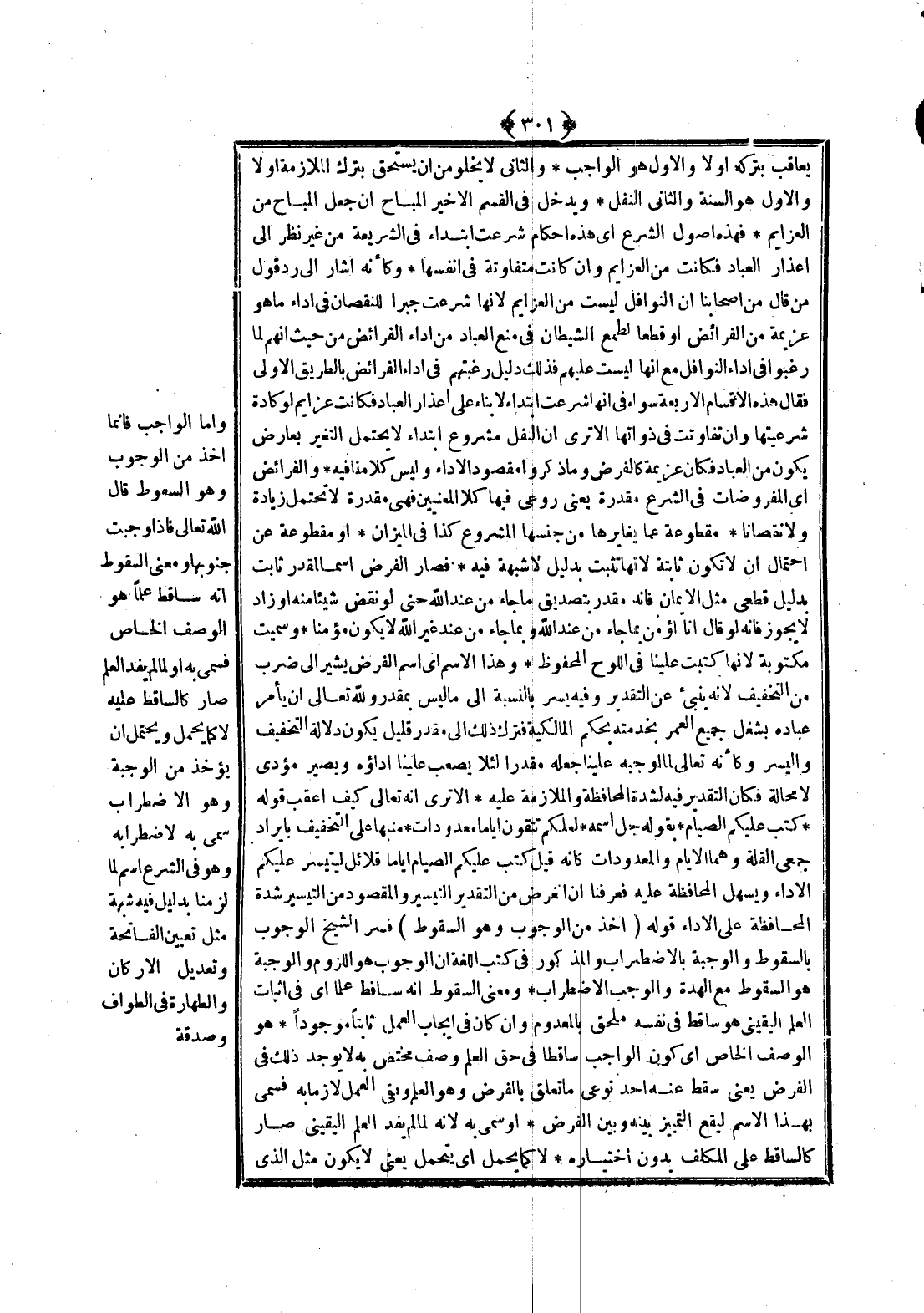 وَمَعْنَى السُّقُوطِ أَنَّهُ سَاقِطٌ عِلْمًا أَيْ فِي إثْبَاتِ الْعِلْمِ الْيَقِينِيِّ هُوَ سَاقِطٌ فِي نَفْسِهِ مُلْحَقٌ بِالْمَعْدُومِ، وَإِنْ كَانَ فِي إيجَابِ الْعَمَلِ ثَابِتًا مَوْجُودًا. هُوَ الْوَصْفُ الْخَاصُّ أَيْ كَوْنُ الْوَاجِبِ سَاقِطًا فِي حَقِّ الْعِلْمِ وَصْفٌ مُخْتَصٌّ بِهِ لَا يُوجَدُ ذَلِكَ فِي الْفَرْضِ يَعْنِي سَقَطَ عَنْهُ أَحَدُ نَوْعَيْ مَا تَعَلَّقَ بِالْفَرْضِ، وَهُوَ الْعِلْمُ وَبَقِيَ الْعِلْمُ لَازِمًا بِهِ فَسُمِّيَ بِهَذَا الِاسْمِ لِيَقَعَ التَّمْيِيزُ بَيْنَهُ وَبَيْنَ الْفَرْضِ. أَوْ سُمِّيَ بِهِ؛ لِأَنَّهُ لَمَّا لَمْ يُفِدْ الْعِلْمَ الْيَقِينِيَّ صَارَ كَالسَّاقِطِ عَلَى الْمُكَلَّفِ بِدُونِ اخْتِيَارِهِ. لَا كَمَا يُحْمَلُ أَيْ يُتَحَمَّلُ يَعْنِي لَا يَكُونُ مِثْلَ الَّذِي