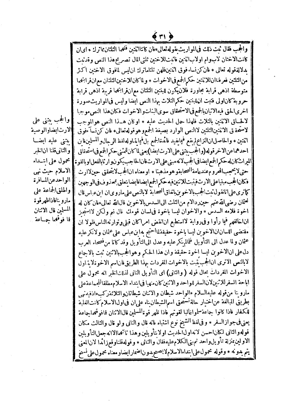 ـــــــــــــــــــــــــــــQوَالْحَجْبِ فَقَالَ ثَبَتَ ذَلِكَ فِي الْمَوَارِيثِ بِقَوْلِهِ تَعَالَى {فَإِنْ كَانَتَا اثْنَتَيْنِ فَلَهُمَا الثُّلُثَانِ مِمَّا تَرَكَ} [النساء: 176] أَيْ إنْ كَانَتْ الْأُخْتَانِ لِأَبٍ وَأُمٍّ أَوْ لِأَبٍ اثْنَتَيْنِ فَأَثْبَتَ لِلْأُخْتَيْنِ ثُلُثَيْ الْمَالِ تَصْرِيحُ هَذَا النَّصِّ وَقَدْ ثَبَتَ بَدَلًا لَهُ قَوْله تَعَالَى {فَإِنْ كُنَّ نِسَاءً فَوْقَ اثْنَتَيْنِ فَلَهُنَّ ثُلُثَا مَا تَرَكَ} [النساء: 11] أَنْ لَيْسَ لِمَا فَوْقَ الْأُخْتَيْنِ أَكْثَرُ مِنْ الثُّلُثَيْنِ فَعَرَفْنَا أَنَّ لِلِاثْنَتَيْنِ حُكْمَ الْجَمْعِ فِي الْأَخَوَاتِ وَلَمَّا كَانَ لِلْأُخْتَيْنِ الثُّلُثَانِ مَعَ أَنَّ قَرَابَتَهُمَا مُتَوَسِّطَةٌ إذْ هِيَ قُرْبَةُ مُجَاوَرَةٍ فَلَأَنْ يَكُونَ لِلْبِنْتَيْنِ الثُّلُثَانِ مَعَ أَنَّ قَرَابَتَهُمَا قَرِيبَةٌ إذْ هِيَ قَرَابَةُ حُرُوبَةٍ كَانَ أَوْلَى فَثَبَتَ أَنَّ لِلْبِنْتَيْنِ حُكْمَ الثَّلَاثِ بِهَذَا النَّصِّ أَيْضًا وَلَيْسَ فِي الْمَوَارِيثِ صُورَةٌ أُخْرَى أَلْحَقَ فِيهِ الْإِتْيَانَ بِالْجَمْعِ فِي الِاسْتِحْقَاقِ سِوَى الْبَنَاتِ وَالْأَخَوَاتِ فَكَانَ هَذَا النَّصُّ مُوجِبًا لِإِلْحَاقِ الِاثْنَتَيْنِ بِالثَّلَاثِ فَلِهَذَا حُمِلَ الْحَدِيثُ عَلَيْهِ أَوْ كَانَ هَذَا النَّصُّ هُوَ الْمُوجِبُ لِاسْتِحْقَاقِ الِاثْنَتَيْنِ الثُّلُثَيْنِ لَا النَّصُّ الْوَارِدُ بِصِيغَةِ الْجَمْعِ وَهُوَ قَوْله تَعَالَى {فَإِنْ كُنَّ نِسَاءً فَوْقَ اثْنَتَيْنِ} [النساء: 11] وَالْحَاصِلُ أَنَّ النِّزَاعَ لَمْ يَقَعْ فِيمَا يُفِيدُ فَائِدَةَ الْجَمْعِ بَلْ فِيمَا يَتَنَاوَلُهُ لَفْظُ الرِّجَالِ وَالْمُسْلِمِينَ فَأَيْنَ أَحَدُهُمَا عَنْ الْآخَرِ.