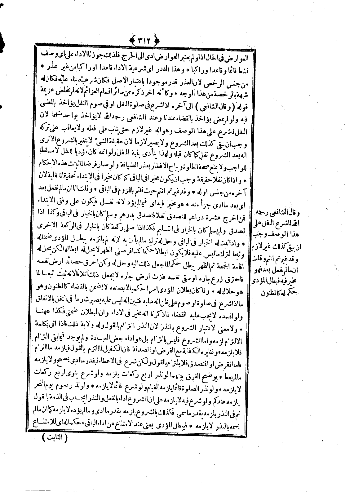 يُوَضِّحُ الْفَرْقَ بَيْنَهُمَا لَوْ نَذَرَ أَرْبَعَ رَكَعَاتٍ يَلْزَمُهُ، وَلَوْ شَرَعَ يَنْوِي أَرْبَعَ رَكَعَاتٍ لَا يَلْزَمُهُ. وَلَوْ نَذَرَ الصَّلَاةَ قَائِمًا يَلْزَمُهُ الْقِيَامُ، وَلَوْ شَرَعَ قَائِمًا لَا يَلْزَمُهُ. وَلَوْ نَذَرَ صَوْمَ يَوْمِ النَّحْرِ يَلْزَمُهُ عِنْدَكُمْ، وَلَوْ شَرَعَ فِيهِ لَا يَلْزَمُهُ عَلَى أَنَّ الشُّرُوعَ أَدَاءٌ بِالْفِعْلِ وَالنَّذْرُ إيجَابٌ فِي الذِّمَّةِ بِالْقَوْلِ ثُمَّ فِي النَّذْرِ يَلْزَمُهُ بِقَدْرِ مَا سَمَّى فَكَذَلِكَ بِالشُّرُوعِ يَلْزَمُهُ بِقَدْرِ مَا أَدَّى، وَمَا لَمْ يُؤَدِّهِ لَا يَلْزَمُهُ كَمَا أَنَّ مَا لَمْ يُسَمِّهِ بِالنَّذْرِ لَا يَلْزَمُهُ. فَبَطَلَ الْمُؤَدَّى يَعْنِي عِنْدَ الِامْتِنَاعِ عَنْ أَدَاءِ الْبَاقِي. حُكْمًا لَهُ أَيْ لِلِامْتِنَاعِ