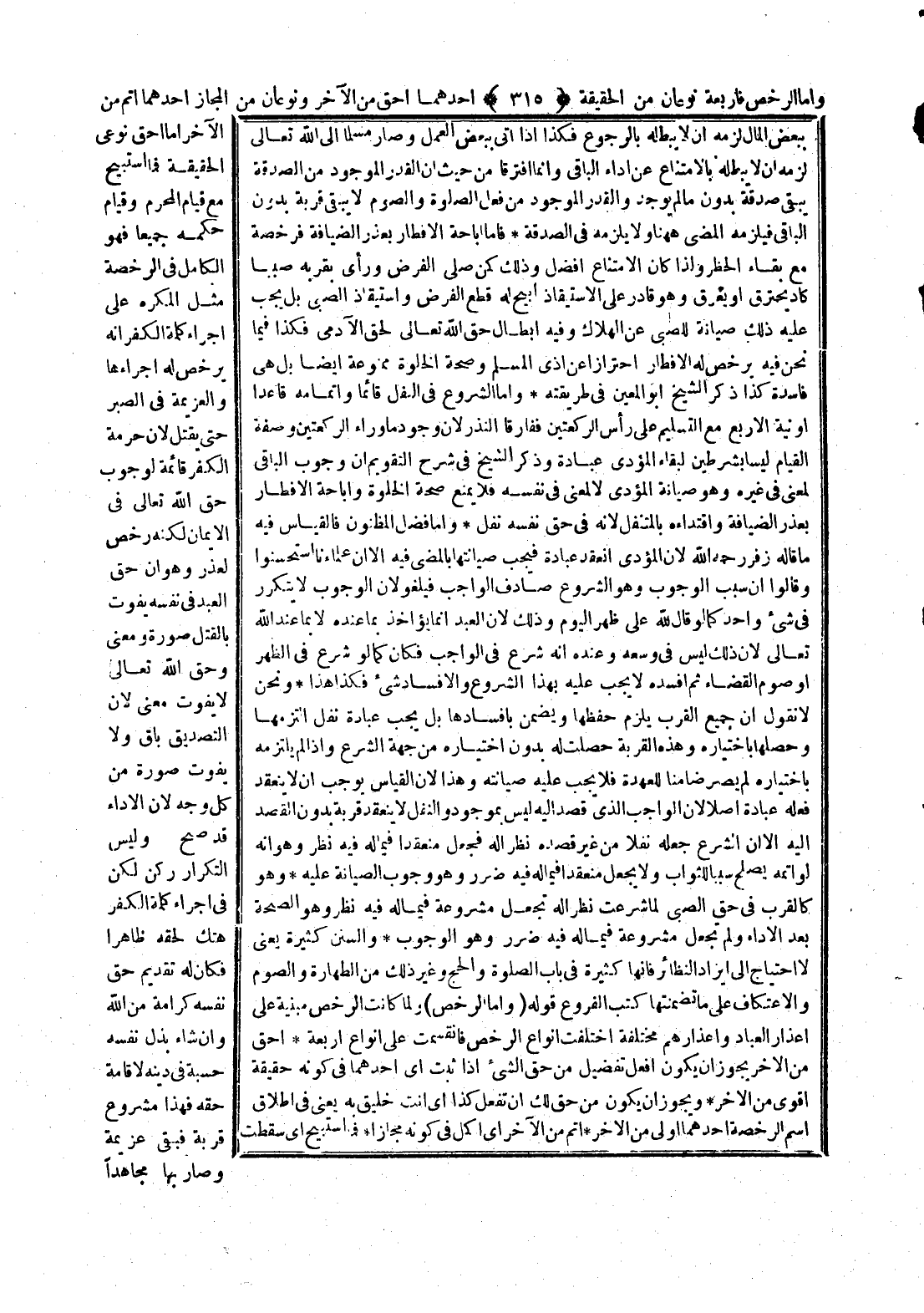 وَأَمَّا الرُّخَصُ فَأَرْبَعَةٌ نَوْعَانِ مِنْ الْحَقِيقَةِ أَحَدُهُمَا أَحَقُّ مِنْ الْآخَرِ وَنَوْعَانِ مِنْ الْمَجَازِ أَحَدُهُمَا أَتَمُّ مِنْ الْآخَرِ أَمَّا أَحَقُّ نَوْعَيْ الْحَقِيقَةِ فَمَا اُسْتُبِيحَ مَعَ قِيَامِ الْمُحَرَّمِ وَقِيَامُ حُكْمِهِ جَمِيعًا فَهُوَ الْكَامِلُ فِي الرُّخْصَةِ مِثْلُ الْمُكْرَهِ عَلَى إجْرَاءِ كَلِمَةِ الْكُفْرِ أَنَّهُ يُرَخَّصُ لَهُ إجْرَاؤُهَا وَالْعَزِيمَةُ فِي الصَّبْرِ حَتَّى يُقْتَلَ؛ لِأَنَّ حُرْمَةَ الْكُفْرِ قَائِمَةٌ لِوُجُوبِ حَقِّ اللَّهِ تَعَالَى فِي الْإِيمَانِ لَكِنَّهُ رُخِّصَ لِعُذْرٍ، وَهُوَ أَنَّ حَقَّ الْعَبْدِ فِي نَفْسِهِ يَفُوتُ بِالْقَتْلِ صُورَةً وَمَعْنًى وَحَقُّ اللَّهِ تَعَالَى لَا يَفُوتُ مَعْنًى؛ لِأَنَّ التَّصْدِيقَ بَاقٍ وَلَا يَفُوتُ صُورَةً مِنْ كُلِّ وَجْهٍ؛ لِأَنَّ الْأَدَاءَ قَدْ صَحَّ، وَلَيْسَ التَّكْرَارُ رُكْنًا لَكِنْ فِي إجْرَاءِ كَلِمَةِ الْكُفْرِ هَتْكٌ لِحَقِّهِ ظَاهِرًا فَكَانَ لَهُ تَقْدِيمُ حَقِّ نَفْسِهِ كَرَامَةً مِنْ اللَّهِ، وَإِنْ شَاءَ بَذَلَ نَفْسَهُ حِسْبَةً فِي دِينِهِ لِإِقَامَةِ حَقِّهِ فَهَذَا مَشْرُوعٌ قُرْبَةً فَبَقِيَ عَزِيمَةً وَصَارَ بِهَا مُجَاهِدًا
