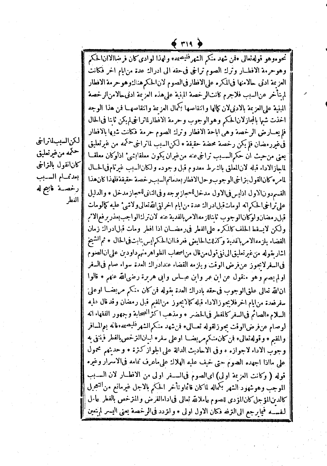 لَكِنَّ السَّبَبَ لَمَّا تَرَاخَى حُكْمُهُ مِنْ غَيْرِ تَعْلِيقٍ يَعْنِي مِنْ حَيْثُ إنَّ حُكْمَ السَّبَبِ تَرَاخَى عَنْهُ مِنْ غَيْرِ أَنْ يَكُونَ مُعَلَّقًا بِشَيْءٍ إذْ لَوْ كَانَ مُعَلَّقًا لَمَا جَازَ الْأَدَاءُ قَبْلَهُ؛ لِأَنَّ الْمُعَلَّقَ بِالشَّرْطِ مَعْدُومٌ قَبْلَ وُجُودِهِ، وَلَكَانَ السَّبَبُ غَيْرَ تَامٍّ فِي الْحَالِ لِمَا مَرَّ. كَانَ الْقَوْلُ بِتَرَاخِي الْوُجُوبِ وَحِلِّ الْإِفْطَارِ بَعْدَمَا تَمَّ السَّبَبُ رُخْصَةً حَقِيقَةً فَلِهَذَا كَانَ هَذَا الْقِسْمُ دُونَ الْأَوَّلِ إذْ لَيْسَ فِي الْأَوَّلِ مَدْخَلٌ لِلْمَجَازِ يُوَجَّهُ، وَفِي الثَّانِي لِلْمَجَازِ مَدْخَلٌ. وَالدَّلِيلُ عَلَى تَرَاخِي الْحُكْمِ أَنَّهُ لَوْ مَاتَ قَبْلَ إدْرَاكِ عِدَّةٍ مِنْ أَيَّامٍ أُخَرَ لَقِيَ اللَّهَ تَعَالَى، وَلَا شَيْءَ عَلَيْهِ كَمَا لَوْ مَاتَ قَبْلَ رَمَضَانَ، وَلَوْ كَانَ الْوُجُوبُ ثَابِتًا لَلَزِمَهُ الْأَمْرُ بِالْفِدْيَةِ عَنْهُ؛ لِأَنَّهُ تَرَكَ الْوَاجِبَ بِعُذْرٍ يَرْفَعُ الْإِثْمَ، وَلَكِنْ لَا يَسْقُطُ الْحَلِفُ كَالْمُكْرَهِ عَلَى الْفِطْرِ فِي رَمَضَانَ إذَا أَفْطَرَ، وَمَاتَ قَبْلَ إدْرَاكِ زَمَانِ الْقَضَاءِ يَلْزَمُهُ الْأَمْرُ بِالْفِدْيَةِ، وَكَذَلِكَ الْحَائِضُ فَعَرَفْنَا أَنَّ الْحُكْمَ لَيْسَ بِثَابِتٍ فِي الْحَالِ.