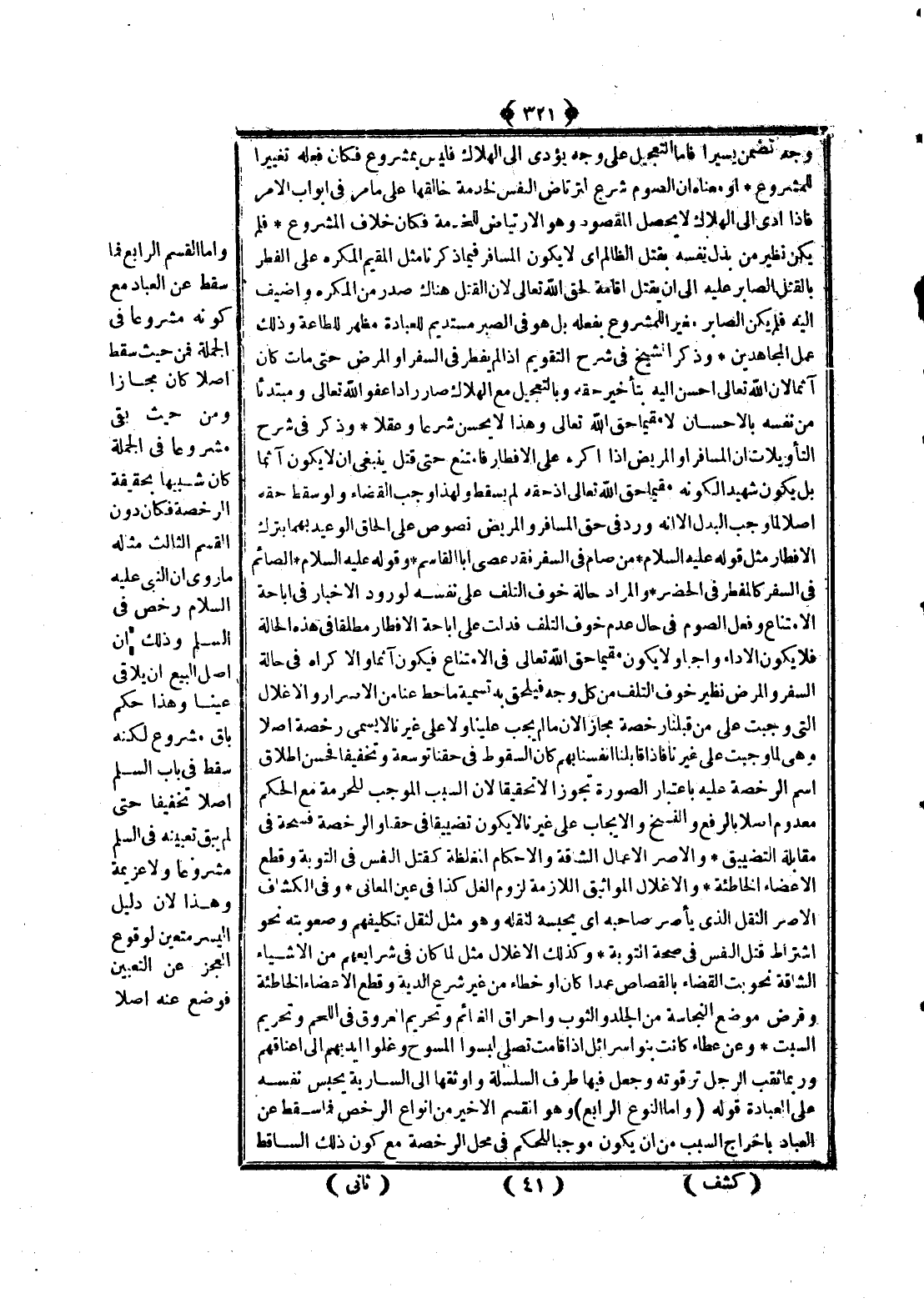 وَأَمَّا الْقِسْمُ الرَّابِعُ فَمَا سَقَطَ عَنْ الْعِبَادَةِ مَعَ كَوْنِهِ مَشْرُوعًا فِي الْجُمْلَةِ فَمِنْ حَيْثُ سَقَطَ أَصْلًا كَانَ مَجَازًا وَمِنْ حَيْثُ بَقِيَ مَشْرُوعًا فِي الْجُمْلَةِ كَانَ شَبِيهًا بِحَقِيقَةِ الرُّخْصَةِ فَكَانَ دُونَ الْقِسْمِ الثَّالِثِ مِثَالُهُ مَا رُوِيَ «أَنَّ النَّبِيَّ - عَلَيْهِ السَّلَامُ - رَخَّصَ فِي السَّلَمِ» وَذَلِكَ أَنَّ أَصْلَ الْبَيْعِ أَنْ يُلَاقِيَ عَيْنًا، وَهَذَا حُكْمٌ بَاقٍ مَشْرُوعٌ لَكِنَّهُ سَقَطَ فِي بَابِ السَّلَمِ أَصْلًا تَخْفِيفًا حَتَّى لَمْ يَبْقَ تَعْيِينُهُ فِي السَّلَمِ مَشْرُوعًا وَلَا عَزِيمَةً؛ وَهَذَا لِأَنَّ دَلِيلَ الْيُسْرِ مُتَعَيِّنٌ لِوُقُوعِ الْعَجْزِ عَنْ التَّعْيِينِ فَوُضِعَ عَنْهُ أَصْلًا