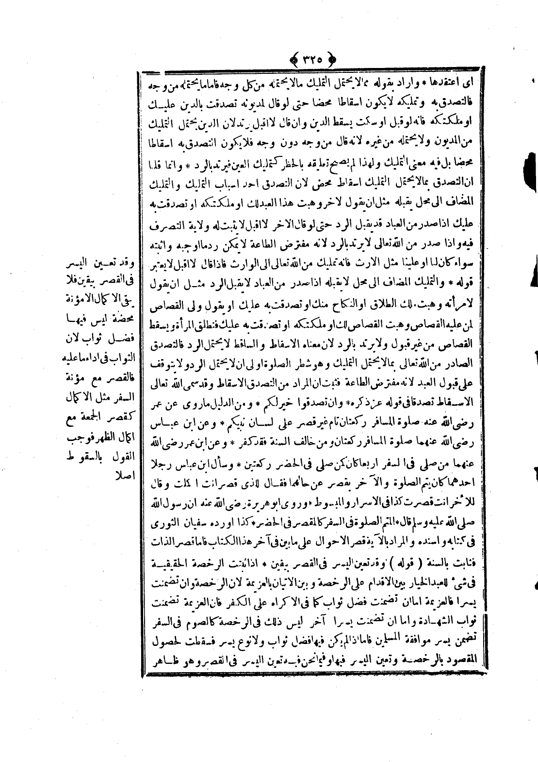 وَمِنْ الدَّلِيلِ مَا رُوِيَ «عَنْ عُمَرَ - رَضِيَ اللَّهُ عَنْهُ - صَلَاةُ الْمُسَافِرِ رَكْعَتَانِ تَامٌّ غَيْرُ قَصْرٍ عَلَى لِسَانِ نَبِيِّكُمْ» . وَعَنْ ابْنِ عَبَّاسٍ - رَضِيَ اللَّهُ عَنْهُمَا - صَلَاةُ الْمُسَافِرِ رَكْعَتَانِ، وَمَنْ خَالَفَ السُّنَّةَ فَقَدْ كَفَرَ. وَعَنْ ابْنِ عُمَرَ - رَضِيَ اللَّهُ عَنْهُمَا - مَنْ صَلَّى فِي السَّفَرِ أَرْبَعًا كَانَ كَمَنْ صَلَّى فِي الْحَضَرِ رَكْعَتَيْنِ. وَسَأَلَ ابْنَ عَبَّاسٍ رَجُلَانِ أَحَدُهُمَا كَانَ يُتِمُّ الصَّلَاةَ وَالْآخَرُ يَقْصُرُ عَنْ حَالِهِمَا فَقَالَ لِلَّذِي قَصَرَ أَنْتَ أَكْمَلْت وَقَالَ لِلْآخَرِ أَنْتَ قَصَرْت كَذَا فِي الْأَسْرَارِ وَالْمَبْسُوطِ. وَرَوَى أَبُو هُرَيْرَةَ - رَضِيَ اللَّهُ عَنْهُ - أَنَّ رَسُولَ اللَّهِ - صَلَّى اللَّهُ عَلَيْهِ وَسَلَّمَ - قَالَ: «الْمُتِمُّ الصَّلَاةَ فِي السَّفَرِ كَالْمُقْصِرِ فِي الْحَضْرَةِ» . كَذَا أَوْرَدَهُ سُفْيَانُ الثَّوْرِيُّ فِي كِتَابِهِ، وَأَسْنَدَهُ وَالْمُرَادُ بِالْآيَةِ قَصْرُ الْأَحْوَالِ عَلَى مَا بَيَّنَ فِي آخِرِ هَذَا الْكِتَابِ فَأَمَّا قَصْرُ الذَّاتِ فَثَابِتٌ بِالسُّنَّةِ (قَوْلُهُ) وَقَدْ تَعَيَّنَ الْيُسْرُ فِي الْقَصْرِ بِيَقِينٍ.