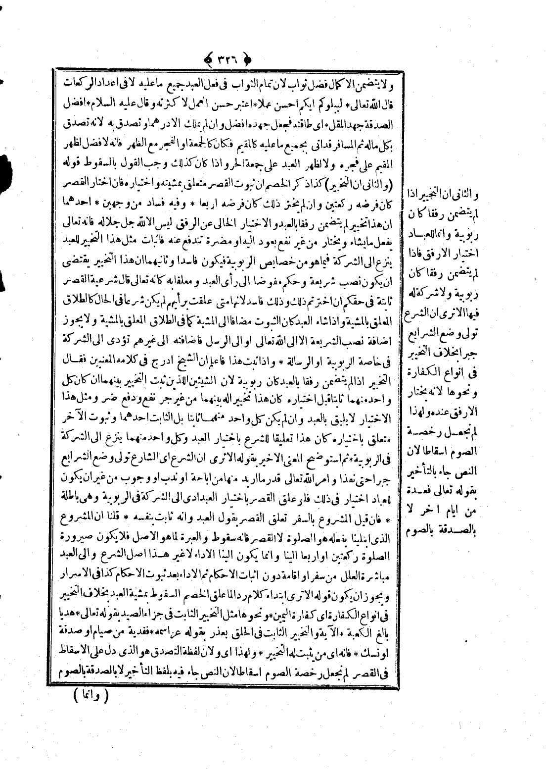 فَإِنْ اخْتَارَ الْقَصْرَ كَانَ فَرْضُهُ رَكْعَتَيْنِ، وَإِنْ لَمْ يَخْتَرْ ذَلِكَ كَانَ فَرْضُهُ أَرْبَعًا.، وَفِيهِ فَسَادٌ مِنْ وَجْهَيْنِ. أَحَدُهُمَا أَنَّ هَذَا تَخْيِيرٌ لَمْ يَتَضَمَّنْ رِفْقًا بِالْعَبْدِ وَالِاخْتِيَارُ الْخَالِي عَنْ الرِّفْقِ لَيْسَ إلَّا لِلَّهِ جَلَّ جَلَالُهُ فَإِنَّهُ تَعَالَى يَفْعَلُ مَا يَشَاءُ وَيَخْتَارُ مِنْ غَيْرِ نَفْعٍ يَعُودُ إلَيْهِ أَوْ مَضَرَّةٍ تَنْدَفِعُ عَنْهُ فَإِثْبَاتُ مِثْلِ هَذَا التَّخْيِيرِ لِلْعَبْدِ يَنْزِعُ إلَى الشَّرِكَةِ فِيمَا هُوَ مِنْ خَصَائِصِ الرُّبُوبِيَّةِ فَيَكُونُ فَاسِدًا وَثَانِيهِمَا أَنَّ هَذَا التَّخْيِيرَ يَقْتَضِي أَنْ يَكُونَ نَصْبُ شَرِيعَةٍ وَحُكْمٍ مُفَوَّضًا إلَى رَأْيِ الْعَبْدِ، وَمُعَلَّقًا بِهِ كَأَنَّهُ تَعَالَى قَالَ شَرْعِيَّةُ الْقَصْرِ ثَابِتَةٌ فِي حَقِّكُمْ إنْ اخْتَرْتُمْ ذَلِكَ وَذَلِكَ فَاسِدٌ؛ لِأَنَّهَا مَتَى عُلِّقَتْ بِرَأْيِهِمْ لَمْ يَكُنْ شَرْعًا فِي الْحَالِ كَالطَّلَاقِ الْمُعَلَّقِ بِالْمَشِيئَةِ، وَإِذَا شَاءَ الْعَبْدُ كَانَ الثُّبُوتُ مُضَافًا إلَى الْمَشِيئَةِ كَمَا فِي الطَّلَاقِ الْمُعَلَّقِ بِالْمَشِيئَةِ، وَلَا يَجُوزُ إضَافَةُ نَصْبِ الشَّرِيعَةِ إلَّا إلَى اللَّهِ تَعَالَى أَوْ إلَى الرُّسُلِ فَإِضَافَتُهُ إلَى غَيْرِهِمْ تُؤَدِّي إلَى الشَّرِكَةِ فِي خَاصَّةِ الرُّبُوبِيَّةِ أَوْ الرِّسَالَةِ. وَإِذَا ثَبَتَ هَذَا فَاعْلَمْ أَنَّ الشَّيْخَ أَدْرَجَ فِي كَلَامِهِ الْمَعْنَيَيْنِ فَقَالَ التَّخْيِيرُ إذَا لَمْ يَتَضَمَّنْ رِفْقًا بِالْعَبْدِ كَانَ رُبُوبِيَّةً؛ لِأَنَّ الشَّيْئَيْنِ اللَّذَيْنِ ثَبَتَ التَّخْيِيرُ بَيْنَهُمَا إنْ كَانَ كُلُّ وَاحِدٍ مِنْهُمَا ثَابِتًا قَبْلَ اخْتِيَارِهِ كَانَ هَذَا تَخْيِيرًا لَهُ بَيْنَهُمَا مِنْ غَيْرِ جَرِّ نَفْعٍ وَدَفْعِ ضُرٍّ، وَمِثْلُ هَذَا الِاخْتِيَارِ لَا يَلِيقُ بِالْعَبْدِ، وَإِنْ لَمْ يَكُنْ كُلُّ وَاحِدٍ مِنْهُمَا ثَابِتًا بَلْ الثَّابِتُ أَحَدُهُمَا وَثُبُوتُ الْآخَرِ مُتَعَلِّقٌ بِاخْتِيَارِهِ كَانَ هَذَا تَعْلِيقًا لِلشَّرْعِ بِاخْتِيَارِ الْعَبْدِ وَكُلُّ وَاحِدٍ مِنْهُمَا يَنْزِعُ إلَى الشَّرِكَةِ فِي الرُّبُوبِيَّةِ ثُمَّ اسْتَوْضَحَ الْمَعْنَى الْأَخِيرَ بِقَوْلِهِ أَلَا تَرَى أَنَّ الشَّرْعَ أَيْ الشَّارِعَ تَوَلَّى وَضْعَ الشَّرَائِعِ جَبْرًا حَتَّى نَفَّذَ أَوَامِرَ اللَّهِ تَعَالَى قَدْرَ مَا أُرِيدَ مِنْهَا مِنْ إبَاحَةٍ وَنَدْبٍ أَوْ وُجُوبٍ مِنْ غَيْرِ أَنْ يَكُونَ لِلْعِبَادِ اخْتِيَارٌ فِي ذَلِكَ فَلَوْ عَلَّقَ الْقَصْرَ بِاخْتِيَارِ الْعَبْدِ أَدَّى إلَى الشَّرِكَةِ فِي الرُّبُوبِيَّةِ، وَهِيَ بَاطِلَةٌ.