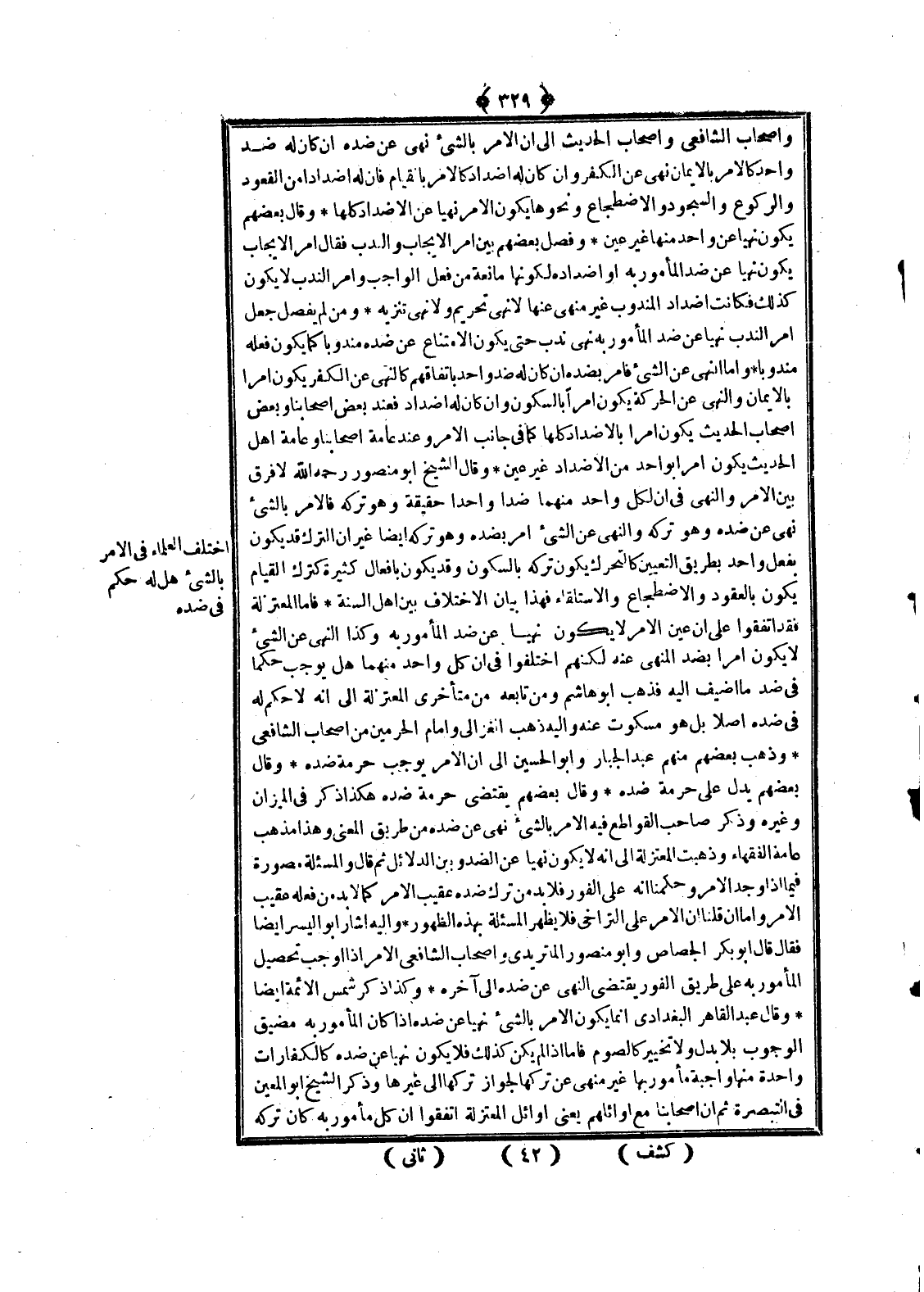 فَأَمَّا الْمُعْتَزِلَةُ فَقَدْ اتَّفَقُوا عَلَى أَنَّ عَيْنَ الْأَمْرِ لَا يَكُونُ نَهْيًا عَنْ ضِدِّ الْمَأْمُورِ بِهِ، وَكَذَا النَّهْيُ عَنْ الشَّيْءِ لَا يَكُونُ أَمْرًا بِضِدِّ الْمَنْهِيِّ عَنْهُ لَكِنَّهُمْ اخْتَلَفُوا فِي أَنَّ كُلَّ وَاحِدٍ مِنْهُمَا هَلْ يُوجِبُ حُكْمًا فِي ضِدِّ مَا أُضِيفَ إلَيْهِ فَذَهَبَ أَبُو هَاشِمٍ، وَمَنْ تَابَعَهُ مِنْ مُتَأَخِّرِي الْمُعْتَزِلَةِ إلَى أَنَّهُ لَا حُكْمَ لَهُ فِي ضِدِّهِ أَصْلًا بَلْ هُوَ مَسْكُوتٌ عَنْهُ، وَإِلَيْهِ ذَهَبَ الْغَزَالِيُّ وَإِمَامُ الْحَرَمَيْنِ مِنْ أَصْحَابِ الشَّافِعِيِّ. وَذَهَبَ بَعْضُهُمْ مِنْهُمْ عَبْدُ الْجَبَّارِ وَأَبُو الْحُسَيْنِ إلَى أَنَّ الْأَمْرَ يُوجِبُ حُرْمَةَ ضِدِّهِ. وَقَالَ بَعْضُهُمْ يَدُلُّ عَلَى حُرْمَةِ ضِدِّهِ. وَقَالَ بَعْضُهُمْ يَقْتَضِي حُرْمَةَ ضِدِّهِ هَكَذَا ذَكَرَ فِي الْمِيزَانِ وَغَيْرِهِ، وَذَكَرَ صَاحِبُ الْقَوَاطِعِ فِيهِ الْأَمْرُ بِالشَّيْءِ نَهْيٌ عَنْ ضِدِّهِ مِنْ طَرِيقِ الْمَعْنَى، وَهَذَا مَذْهَبُ عَامَّةِ الْفُقَهَاءِ وَذَهَبَتْ الْمُعْتَزِلَةُ إلَى أَنَّهُ لَا يَكُونُ نَهْيًا عَنْ الضِّدِّ وَبَيَّنَ الدَّلَائِلَ ثُمَّ قَالَ وَالْمَسْأَلَةُ مُصَوَّرَةٌ فِيمَا إذَا وُجِدَ الْأَمْرُ وَحَكَمْنَا أَنَّهُ عَلَى الْفَوْرِ فَلَا بُدَّ مِنْ تَرْكِ ضِدِّهِ عَقِيبَ الْأَمْرِ كَمَا لَا بُدَّ مِنْ فِعْلِهِ عَقِيبَ الْأَمْرِ، وَأَمَّا إنْ قُلْنَا إنَّ الْأَمْرَ عَلَى التَّرَاخِي فَلَا يُظْهِرُ الْمَسْأَلَةَ بِهَذِهِ الظُّهُورِ. وَإِلَيْهِ أَشَارَ أَبُو الْيُسْرِ أَيْضًا فَقَالَ أَبُو بَكْرٍ الْجَصَّاصُ وَأَبُو مَنْصُورٍ الْمَاتُرِيدِيُّ، وَأَصْحَابُ الشَّافِعِيِّ: الْأَمْرُ إذَا أَوْجَبَ تَحْصِيلَ الْمَأْمُورِ بِهِ عَلَى طَرِيقِ الْفَوْرِ يَقْتَضِي النَّهْيَ عَنْ ضِدِّهِ إلَى آخِرِهِ. وَكَذَا ذَكَرَ شَمْسُ الْأَئِمَّةِ أَيْضًا.