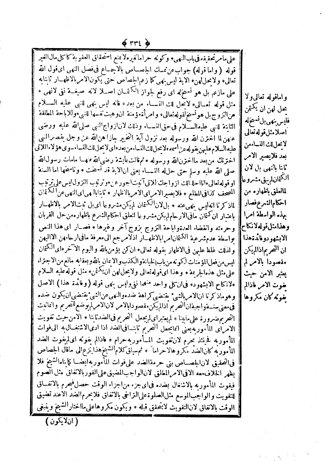 وَكَوْنُهُ حَرَامًا لِغَيْرِهِ لَا يَمْنَعُ اسْتِحْقَاقَ الْعُقُوبَةِ كَأَكْلِ مَالِ الْغَيْرِ قَوْلُهُ: (وَأَمَّا قَوْلُهُ) جَوَابٌ عَنْ تَمَسُّكِ الْجَصَّاصُ بِالْإِجْمَاعِ فِي فَصْلِ النَّهْيِ أَيْ قَوْلُ اللَّهِ تَعَالَى: وَلَا يَحِلُّ لَهُنَّ. الْآيَةَ لَيْسَ بِنَهْيٍ كَمَا زَعَمَ الْجَصَّاصُ حَتَّى يَكُونَ الْأَمْرُ بِالْإِظْهَارِ ثَابِتًا بِهِ عَلَى مَا زَعَمَ بَلْ هُوَ نَسْخٌ لَهُ أَيْ رَفْعٌ لِجَوَازِ الْكِتْمَانِ أَصْلًا؛ لِأَنَّهُ صِيغَةُ نَفْيٍ لَا نَهْيٍ. مِثْلُ قَوْله تَعَالَى: {لا يَحِلُّ لَكَ النِّسَاءُ مِنْ بَعْدُ} [الأحزاب: 52] . فَإِنَّهُ لَيْسَ بِنَهْيٍ لِلنَّبِيِّ - عَلَيْهِ السَّلَامُ - عَنْ التَّزَوُّجِ بَلْ هُوَ نَسْخٌ لِقَوْلِهِ تَعَالَى: {وَامْرَأَةً مُؤْمِنَةً إِنْ وَهَبَتْ نَفْسَهَا لِلنَّبِيِّ} [الأحزاب: 50] .