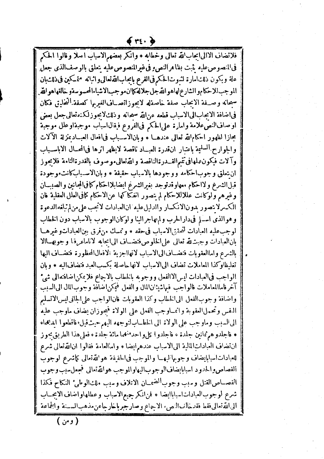 وَأَمَّا الْعَامَّةُ فَقَالُوا: إنَّ اللَّهَ تَعَالَى شَرَعَ لِلْعِبَادَاتِ أَسْبَابًا يُضَافُ وُجُوبُهَا إلَيْهَا وَالْمُوجِبُ فِي الْحَقِيقَةِ هُوَ اللَّهُ تَعَالَى كَمَا شَرَعَ لِوُجُوبِ الْقِصَاصِ وَالْحُدُودِ أَسْبَابًا يُضَافُ الْوُجُوبُ إلَيْهَا، وَالْمُوجِبُ هُوَ اللَّهُ تَعَالَى فَجَعَلَ سَبَبَ وُجُوبِ الْقِصَاصِ الْقَتْلَ وَسَبَبَ وُجُوبِ الضَّمَانِ الْإِتْلَافَ وَسَبَبَ مِلْكِ الْوَاطِئِ النِّكَاحَ، فَكَذَا شَرَعَ لِوُجُوبِ الْعِبَادَاتِ أَسْبَابًا أَيْضًا. فَمَنْ أَنْكَرَ جَمِيعَ الْأَسْبَابِ وَعَطَّلَهَا، وَأَضَافَ الْإِيجَابَ إلَى اللَّهِ تَعَالَى فَقَطْ خَالَفَ النَّصَّ وَالْإِجْمَاعَ وَصَارَ جَبْرِيًّا خَارِجًا عَنْ مَذْهَبِ السُّنَّةِ وَالْجَمَاعَةِ