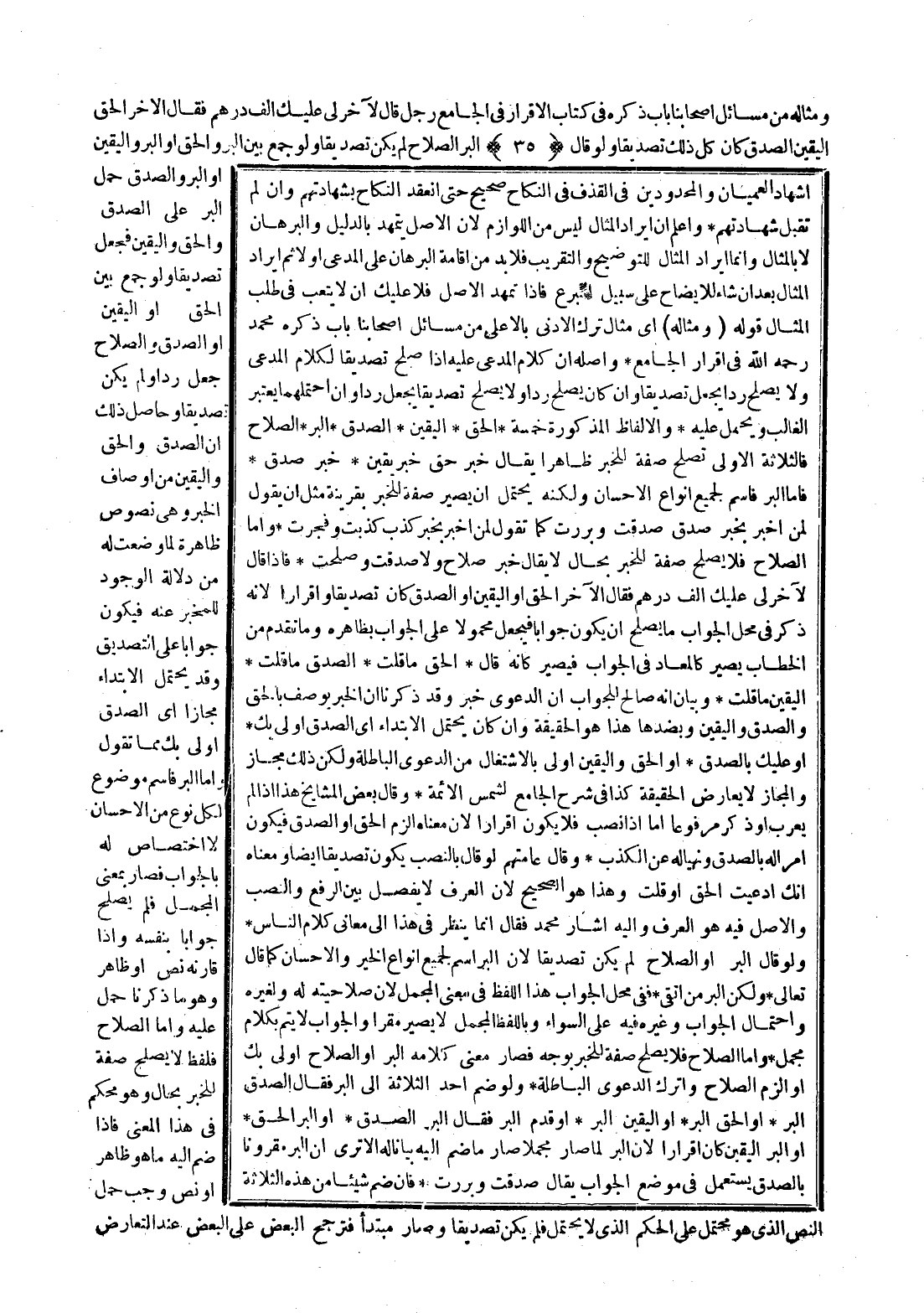 وَقَالَ عَامَّتُهُمْ لَوْ قَالَ بِالنَّصْبِ يَكُونُ تَصْدِيقًا أَيْضًا وَمَعْنَاهُ أَنَّك ادَّعَيْت الْحَقَّ أَوْ قُلْت وَهَذَا هُوَ الصَّحِيحُ؛ لِأَنَّ الْعُرْفَ لَا يَفْصِلُ بَيْنَ الرَّفْعِ وَالنَّصْبِ؛ وَالْأَصْلُ فِيهِ هُوَ الْعُرْفُ وَإِلَيْهِ أَشَارَ مُحَمَّدٌ فَقَالَ إنَّمَا يُنْظَرُ فِي هَذَا إلَى مَعَانِي كَلَامِ النَّاسِ وَلَوْ قَالَ الْبِرُّ أَوْ الصَّلَاحُ لَمْ يَكُنْ تَصْدِيقًا؛ لِأَنَّ الْبِرَّ اسْمٌ لِجَمِيعِ أَنْوَاعِ الْخَيْرِ وَالْإِحْسَانِ كَمَا قَالَ تَعَالَى {وَلَكِنَّ الْبِرَّ مَنِ اتَّقَى} [البقرة: 189] فَفِي مَحَلِّ الْجَوَابِ هَذَا اللَّفْظُ فِي مَعْنَى الْمُجْمَلِ؛ لِأَنَّ صَلَاحِيَتَهُ لَهُ وَلِغَيْرِهِ وَاحْتِمَالُ الْجَوَابِ وَغَيْرِهِ فِيهِ عَلَى السَّوَاءِ وَبِاللَّفْظِ الْمُجْمَلِ لَا يَصِيرُ مُقِرًّا وَالْجَوَابُ لَا يَتِمُّ بِكَلَامٍ مُجْمَلٍ وَأَمَّا الصَّلَاحُ فَلَا يَصْلُحُ صِفَةً لِلْخَبَرِ بِوَجْهٍ فَصَارَ مَعْنَى كَلَامِهِ الْبِرَّ وَالصَّلَاحَ أَوْلَى بِك أَوْ الْزَمْ الصَّلَاحَ وَاتْرُكْ الدَّعْوَى الْبَاطِلَةَ وَلَوْ ضَمَّ أَحَدَ الثَّلَاثَةِ إلَى الْبِرِّ فَقَالَ الصِّدْقُ الْبِرُّ أَوْ الْحَقُّ الْبِرُّ أَوْ الْيَقِينُ الْبِرُّ أَوْ قَدَّمَ الْبِرَّ فَقَالَ الْبِرُّ الصِّدْقُ أَوْ الْبِرُّ الْحَقُّ أَوْ الْبِرُّ الْيَقِينُ كَانَ إقْرَارًا؛ لِأَنَّ الْبِرَّ لَمَّا صَارَ مُجْمَلًا صَارَ مَا ضُمَّ إلَيْهِ بَيَانًا لَهُ، أَلَا تَرَى أَنَّ الْبِرَّ مَقْرُونًا بِالصِّدْقِ يُسْتَعْمَلُ فِي مَوْضِعِ الْجَوَابِ يُقَالُ صَدَقْت وَبَرَرْت فَإِنْ ضُمَّ شَيْئًا مِنْ هَذِهِ الثَّلَاثَةِ