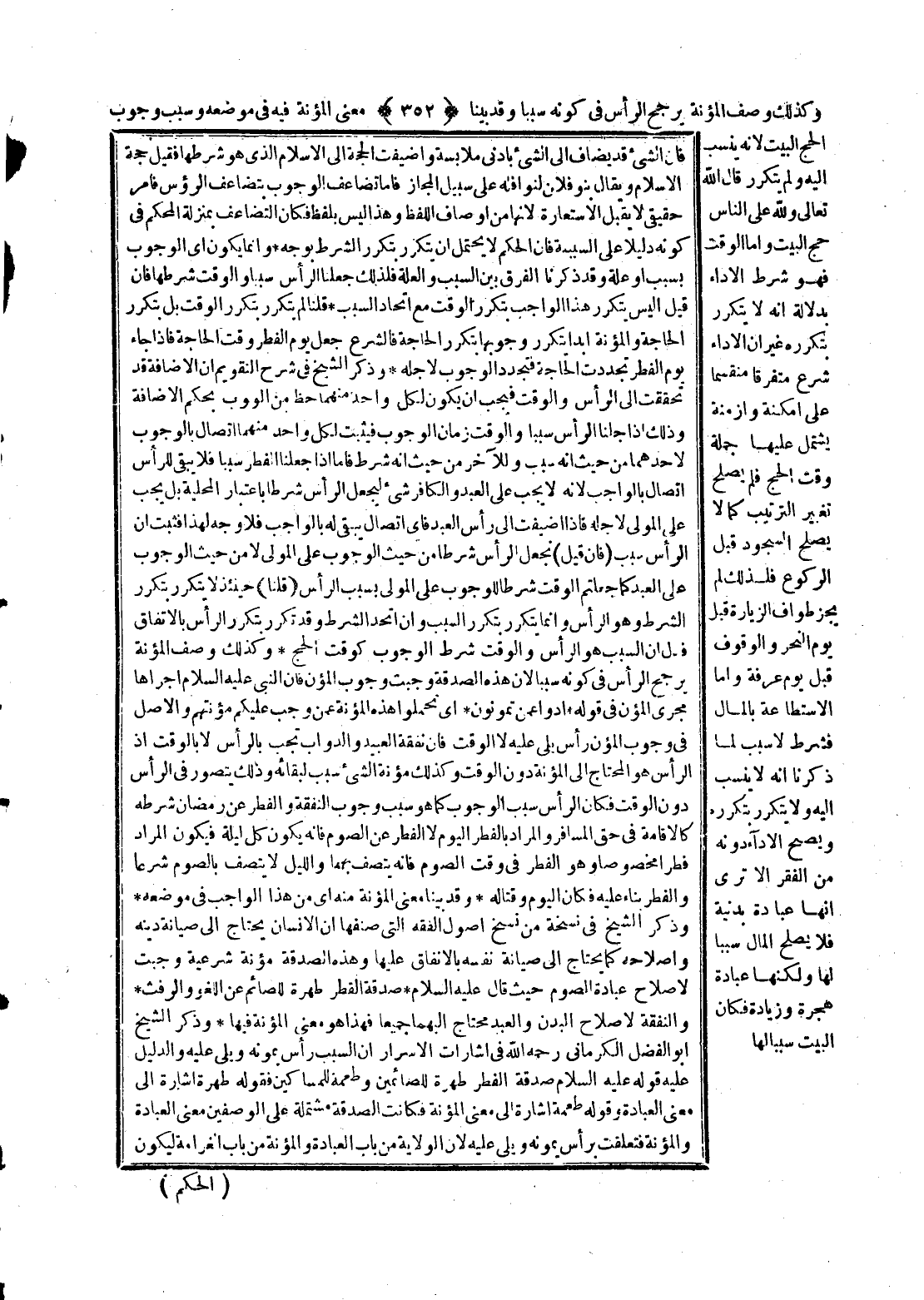 وَذَكَرَ الشَّيْخُ أَبُو الْفَضْلِ الْكَرْمَانِيُّ - رَحِمَهُ اللَّهُ - فِي إشَارَاتِ الْأَسْرَارِ أَنَّ السَّبَبَ رَأْسٌ يُمَوِّنُهُ وَيَلِي عَلَيْهِ وَالدَّلِيلُ عَلَيْهِ قَوْلُهُ - عَلَيْهِ السَّلَامُ - «صَدَقَةُ الْفِطْرِ طُهْرَةٌ لِلصَّائِمِينَ وَطُعْمَةٌ لِلْمَسَاكِينِ» فَقَوْلُهُ طُهْرَةٌ إشَارَةٌ إلَى مَعْنَى الْعِبَادَةِ، وَقَوْلُهُ طُعْمَةٌ إشَارَةٌ إلَى مَعْنَى الْمُؤْنَةِ فَكَانَتْ الصَّدَقَةُ مُشْتَمِلَةً عَلَى الْوَصْفَيْنِ مَعْنَى الْعِبَادَةِ وَالْمُؤْنَةِ فَتَعَلَّقَتْ بِرَأْسٍ يُمَوِّنُهُ وَيَلِي عَلَيْهِ؛ لِأَنَّ الْوِلَايَةَ مِنْ بَابِ الْعِبَادَةِ وَالْمُؤْنَةَ مِنْ بَابِ الْغَرَامَةِ لِيَكُونَ