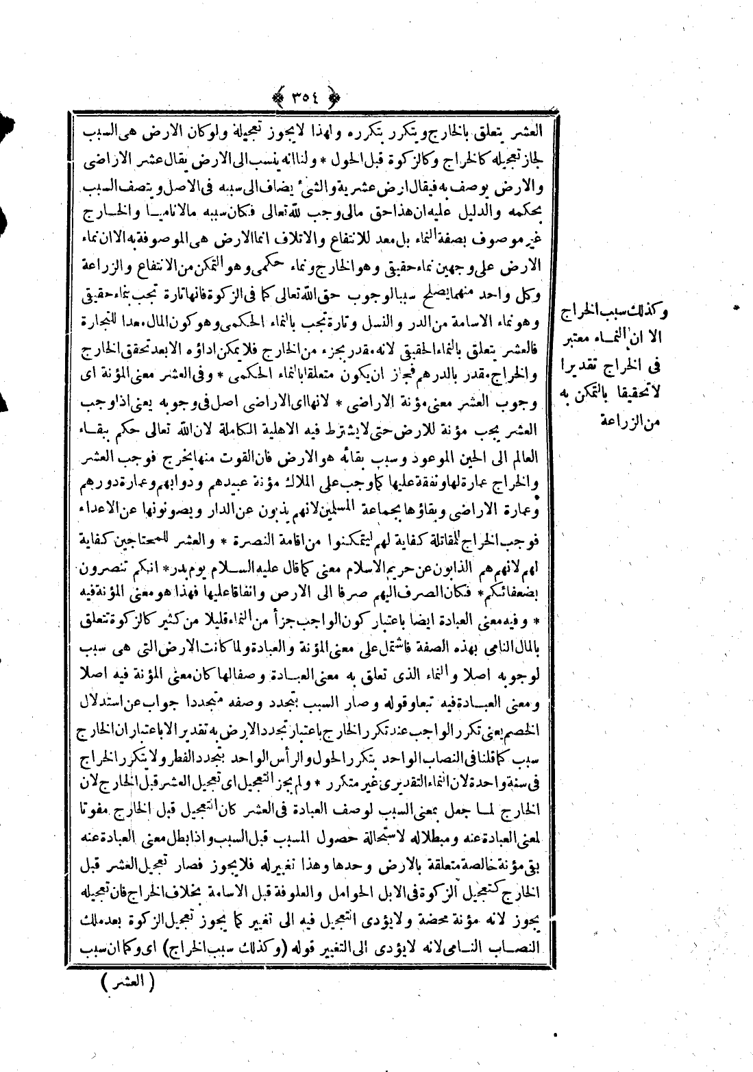 وَفِي الْعُشْرِ مَعْنَى الْمُؤْنَةِ أَيْ وُجُوبُ الْعُشْرِ مَعْنَى مُؤْنَةِ الْأَرَاضِي؛ لِأَنَّهَا أَيْ الْأَرَاضِيَ أَصْلٌ فِي وُجُوبِهِ يَعْنِي إذَا وَجَبَ الْعُشْرُ يَجِبُ مُؤْنَةً لِلْأَرْضِ حَتَّى لَا يُشْتَرَطَ فِيهِ الْأَهْلِيَّةُ الْكَامِلَةُ؛ لِأَنَّ اللَّهَ تَعَالَى حَكَمَ بِبَقَاءِ الْعَالَمِ إلَى الْحِينِ الْمَوْعُودِ، وَسَبَبُ بَقَائِهِ هُوَ الْأَرْضُ فَإِنَّ الْقُوتَ مِنْهَا يَخْرُجُ فَوَجَبَ الْعُشْرُ، وَالْخَرَاجُ عِمَارَةٌ لَهَا وَنَفَقَةٌ عَلَيْهَا كَمَا وَجَبَ عَلَى الْمُلَّاكِ مُؤْنَةُ عَبِيدِهِمْ وَدَوَابِّهِمْ وَعِمَارَةُ دُورِهِمْ وَعِمَارَةُ الْأَرَاضِي وَبَقَاؤُهَا بِجَمَاعَةِ الْمُسْلِمِينَ؛ لِأَنَّهُمْ يَذُبُّونَ عَنْ الدَّارِ وَيَصُونُونَهَا عَنْ الْأَعْدَاءِ فَوَجَبَ الْخَرَاجُ لِلْمُقَاتِلَةِ كِفَايَةً لَهُمْ لِيَتَمَكَّنُوا مِنْ إقَامَةِ النُّصْرَةِ.