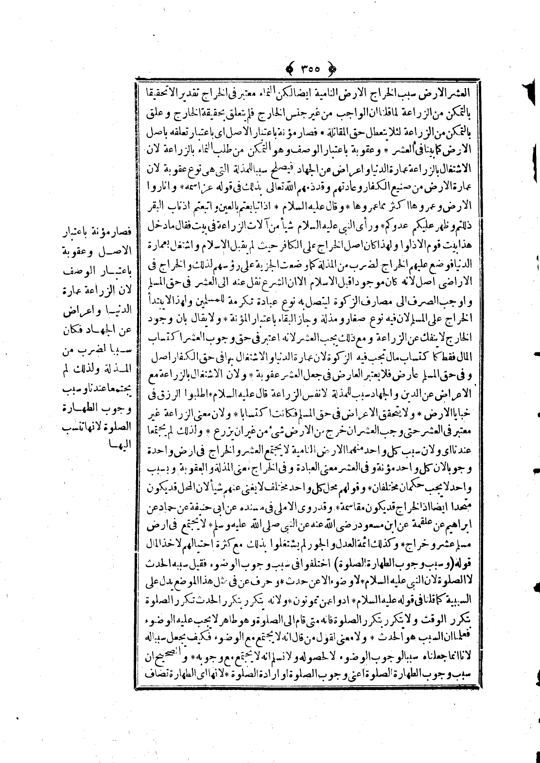 ـــــــــــــــــــــــــــــQالْعُشْرِ الْأَرْضُ فَإِنَّ سَبَبَ الْخَرَاجِ الْأَرْضُ النَّامِيَةُ أَيْضًا لَكِنَّ النَّمَاءَ مُعْتَبَرٌ فِي الْخَرَاجِ تَقْدِيرًا لَا تَحْقِيقًا بِالتَّمَكُّنِ مِنْ الزِّرَاعَةِ لِمَا قُلْنَا إنَّ الْوَاجِبَ مِنْ غَيْرِ جِنْسِ الْخَارِجِ فَلَمْ يَتَعَلَّقْ بِحَقِيقَةِ الْخَارِجِ وَعُلِّقَ بِالتَّمَكُّنِ مِنْ الزِّرَاعَةِ لِئَلَّا يَتَعَطَّلَ حَقُّ الْمُقَاتِلَةِ. فَصَارَ مُؤْنَةً بِاعْتِبَارِ الْأَصْلِ أَيْ بِاعْتِبَارِ تَعَلُّقِهِ بِأَصْلِ الْأَرْضِ كَمَا بَيَّنَّا فِي الْعُشْرِ، وَعُقُوبَةً بِاعْتِبَارِ الْوَصْفِ، وَهُوَ التَّمَكُّنُ مِنْ طَلَبِ النَّمَاءِ بِالزِّرَاعَةِ؛ لِأَنَّ الِاشْتِغَالَ بِالزِّرَاعَةِ عِمَارَةُ الدُّنْيَا، وَإِعْرَاضٌ عَنْ الْجِهَادِ فَيَصْلُحُ سَبَبًا لِلْمَذَلَّةِ الَّتِي هِيَ نَوْعُ عُقُوبَةٍ؛ لِأَنَّ عِمَارَةَ الْأَرْضِ مِنْ صَنِيعِ الْكُفَّارِ وَعَادَتِهِمْ، وَقَدْ ذَمَّهُمْ اللَّهُ تَعَالَى بِذَلِكَ فِي قَوْلِهِ عَزَّ اسْمُهُ: {وَأَثَارُوا الأَرْضَ وَعَمَرُوهَا أَكْثَرَ مِمَّا عَمَرُوهَا} [الروم: 9] . وَقَالَ - عَلَيْهِ السَّلَامُ -: «إذَا تَبَايَعْتُمْ بِالْعِينَةِ وَاتَّبَعْتُمْ أَذْنَابَ الْبَقَرِ ذَلَلْتُمْ وَظَهَرَ عَلَيْكُمْ عَدُوُّكُمْ» «وَرَأَى النَّبِيُّ - عَلَيْهِ السَّلَامُ - شَيْئًا مِنْ آلَاتِ الزِّرَاعَةِ فِي بَيْتٍ فَقَالَ مَا دَخَلَ هَذَا بَيْتَ قَوْمٍ إلَّا ذَلُّوا» وَلِهَذَا كَانَ أَصْلُ الْخَرَاجِ عَلَى الْكَافِرِ حَيْثُ لَمْ يَقْبَلْ الْإِسْلَامَ وَاشْتَغَلَ بِعِمَارَةِ الدُّنْيَا فَوُضِعَ عَلَيْهِمْ الْخَرَاجُ لِضَرْبٍ مِنْ الْمَذَلَّةِ كَمَا وُضِعَتْ الْجِزْيَةُ عَلَى رُءُوسِهِمْ لِذَلِكَ، وَالْخَرَاجُ فِي الْأَرَاضِيِ أَصْلٌ؛ لِأَنَّهُ كَانَ مَوْجُودًا قَبْلَ الْإِسْلَامِ إلَّا أَنَّ الشَّرْعَ نَقَلَ عَنْهُ إلَى الْعُشْرِ فِي حَقِّ الْمُسْلِمِ، وَأَوْجَبَ الصَّرْفَ إلَى مَصَارِفِ الزَّكَاةِ لِيَتَّصِلَ بِهِ نَوْعُ عِبَادَةٍ تَكْرِمَةً لِلْمُسْلِمِينَ؛ وَلِهَذَا لَا يُبْتَدَأُ الْخَرَاجُ عَلَى الْمُسْلِمِ؛ لِأَنَّ فِيهِ نَوْعَ صَغَارٍ، وَمَذَلَّةٍ وَجَازَ الْبَقَاءُ بِاعْتِبَارِ الْمُؤْنَةِ.