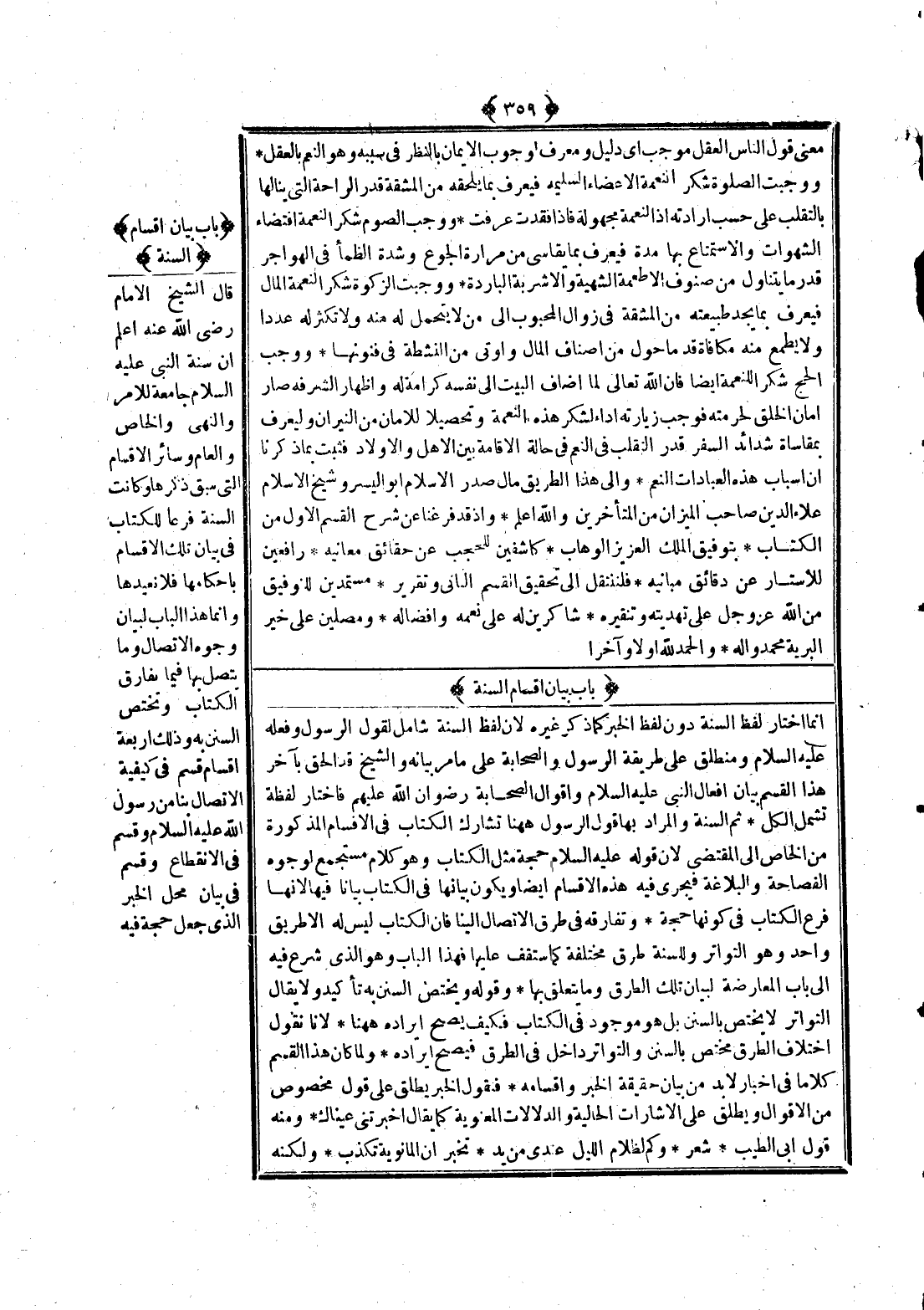 قَالَ الشَّيْخُ الْإِمَامُ - رَضِيَ اللَّهُ عَنْهُ - اعْلَمْ أَنَّ سُنَّةَ النَّبِيِّ - عَلَيْهِ السَّلَامُ - جَامِعَةٌ لِلْأَمْرِ وَالنَّهْيِ وَالْخَاصِّ وَالْعَامِّ وَسَائِرِ الْأَقْسَامِ الَّتِي سَبَقَ ذِكْرُهَا، وَكَانَتْ السُّنَّةُ فَرْعًا لِلْكِتَابِ فِي بَيَانِ تِلْكَ الْأَقْسَامِ بِأَحْكَامِهَا فَلَا نُعِيدُهَا، وَإِنَّمَا هَذَا الْبَابُ لِبَيَانِ وُجُوهِ الِاتِّصَالِ وَمَا يَتَّصِلُ بِهَا فِيمَا يُفَارِقُ الْكِتَابَ وَتَخْتَصُّ السُّنَنُ بِهِ وَذَلِكَ أَرْبَعَةُ أَقْسَامٍ قِسْمٌ فِي كَيْفِيَّةِ الِاتِّصَالِ بِنَا مِنْ رَسُولِ اللَّهِ - عَلَيْهِ السَّلَامُ -، وَقِسْمٌ فِي الِانْقِطَاعِ، وَقِسْمٌ فِي بَيَانِ مَحَلِّ الْخَبَرِ الَّذِي جُعِلَ حُجَّةً فِيهِ