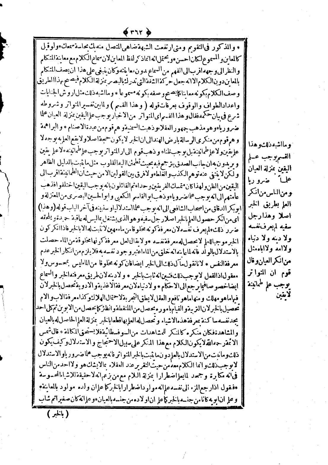 قَوْلُهُ (وَهَذَا الْقِسْمُ) وَلَمَّا بَيَّنَ تَفْسِيرَ الْمُتَوَاتِرِ وَشُرُوطَهُ شَرَعَ فِي بَيَانِ حُكْمِهِ فَقَالَ، وَهَذَا الْقِسْمُ أَيْ الْمُتَوَاتِرُ مِنْ الْأَخْبَارِ يُوجِبُ عِلْمَ الْيَقِينِ بِمَنْزِلَةِ الْعِيَانِ عِلْمًا ضَرُورِيًّا. وَهُوَ مَذْهَبُ جُمْهُورِ الْعُقَلَاءِ وَذَهَبَتْ السُّمَنِيَّةُ، وَهُمْ قَوْمٌ مِنْ عَبَدَةِ الْأَصْنَامِ. وَالْبَرَاهِمَةُ، وَهُمْ قَوْمٌ مِنْ مُنْكِرِي الرِّسَالَةِ بِأَرْضِ الْهِنْدِ إلَى أَنَّ الْخَبَرَ لَا يَكُونُ حُجَّةً أَصْلًا، وَلَا يَقَعُ الْعِلْمُ بِهِ بِوَجْهٍ لَا عِلْمَ يَقِينٍ، وَلَا عِلْمَ طُمَأْنِينَةٍ بَلْ يُوجِبُ ظَنًّا. وَذَهَبَ قَوْمٌ إلَى أَنَّ الْمُتَوَاتِرَ يُوجِبُ عِلْمَ طُمَأْنِينَةٍ لَا عِلْمَ يَقِينٍ وَيُرِيدُونَ بِهِ أَنَّ جَانِبَ الصِّدْقِ يَتَرَجَّحُ فِيهِ بِحَيْثُ تَطْمَئِنُّ إلَيْهِ الْقُلُوبُ مِثْلَ مَا يَثْبُتُ بِالدَّلِيلِ الظَّاهِرِ، وَلَكِنْ لَا يَنْتَفِي عَنْهُ تَوَهُّمُ الْكَذِبِ وَالْغَلَطِ. وَلَا فَرْقَ بَيْنَ الْقَوْلَيْنِ إلَّا مِنْ حَيْثُ إنَّ الطُّمَأْنِينَةَ أَقْرَبُ إلَى الْيَقِينِ مِنْ الظَّنِّ وَلِهَذَا كَانَ مُتَمَسَّكُ الْفَرِيقَيْنِ وَاحِدًا، ثُمَّ الْقَائِلُونَ بِأَنَّهُ يُوجِبُ الْيَقِينَ اخْتَلَفُوا فَذَهَبَ عَامَّتُهُمْ إلَى أَنَّهُ يُوجِبُ عِلْمًا ضَرُورِيًّا. وَذَهَبَ أَبُو الْقَاسِمِ الْكَعْبِيُّ وَأَبُو الْحُسَيْنِ الْبَصْرِيُّ مِنْ الْمُعْتَزِلَةِ وَأَبُو بَكْرٍ الدَّقَّاقُ مِنْ أَصْحَابِ الشَّافِعِيِّ إلَى أَنَّهُ يُوجِبُ عِلْمًا اسْتِدْلَالِيًّا وَسَنُبَيِّنُهُ فِي آخِرِ الْبَابِ.