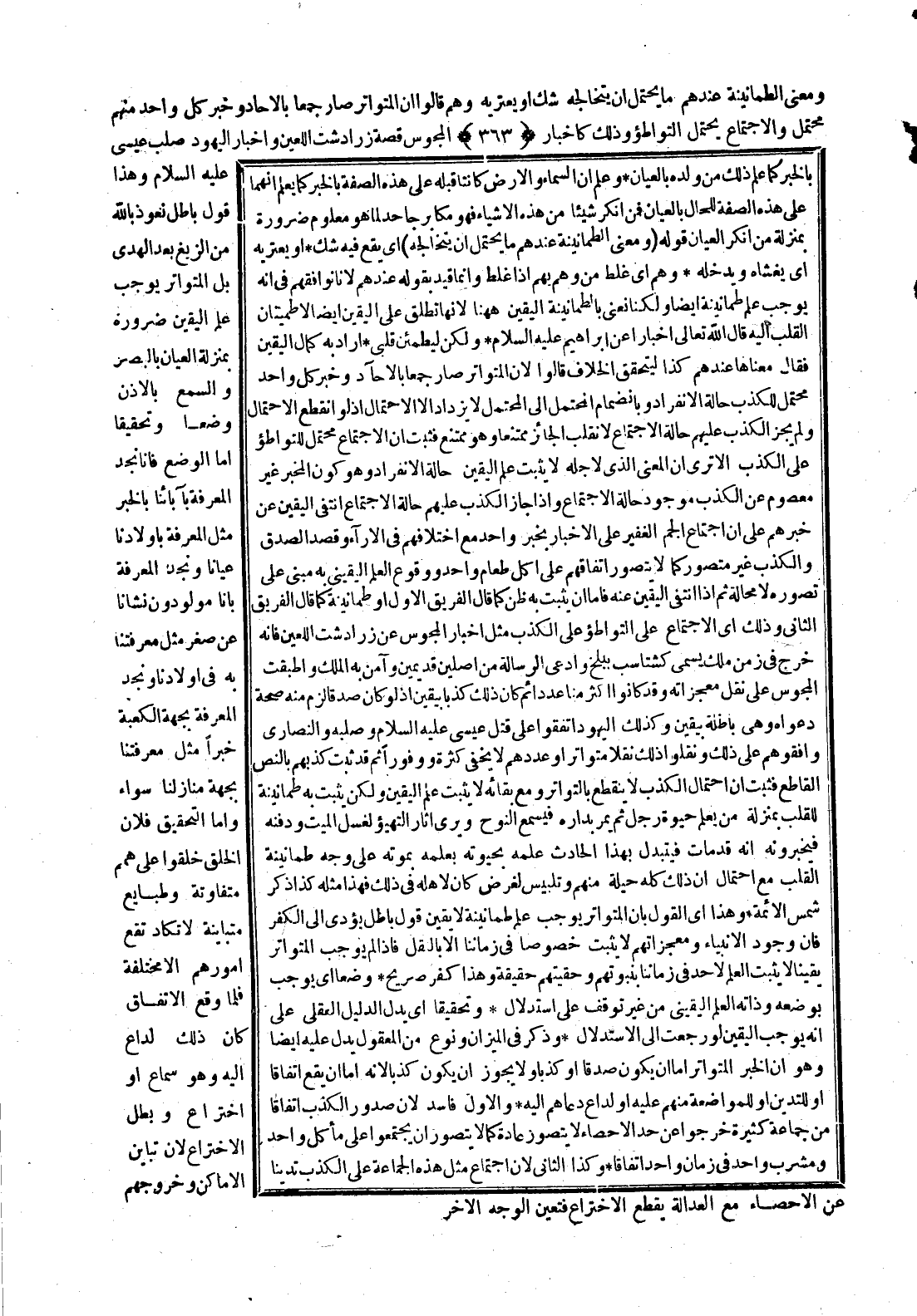 وَمَعْنَى الطُّمَأْنِينَةِ عِنْدَهُمْ مَا يُحْتَمَلُ أَنْ يَتَخَالَجَهُ شَكٌّ أَوْ يَعْتَرِيَهُ وَهْمٌ قَالُوا إنَّ الْمُتَوَاتَرَ صَارَ جَمْعًا بِالْآحَادِ، وَخَبَرُ كُلِّ وَاحِدٍ مِنْهُمْ مُحْتَمَلٌ، وَالِاجْتِمَاعُ يَحْتَمِلُ التَّوَاطُؤَ وَذَلِكَ كَإِخْبَارِ الْمَجُوسِ قِصَّةَ زَرَادُشْتَ اللَّعِينِ، وَإِخْبَارِ الْيَهُودِ صَلْبَ عِيسَى - عَلَيْهِ السَّلَامُ -، وَهَذَا قَوْلٌ بَاطِلٌ نَعُوذُ بِاَللَّهِ مِنْ الزَّيْغِ بَعْدَ الْهُدَى. بَلْ الْمُتَوَاتِرُ يُوجِبُ عِلْمَ الْيَقِينِ ضَرُورَةً بِمَنْزِلَةِ الْعِيَانِ بِالْبَصَرِ وَالسَّمْعِ بِالْأُذُنِ وَضْعًا وَتَحْقِيقًا أَمَّا الْوَضْعُ فَإِنَّا نَجِدُ الْمَعْرِفَةَ بِآبَائِنَا بِالْخَبَرِ مِثْلَ الْمَعْرِفَةِ بِأَوْلَادِنَا عِيَانًا وَنَجِدُ الْمَعْرِفَةَ بِأَنَّا مَوْلُودُونَ نَشَأْنَا عَنْ صِغَرٍ مِثْلَ مَعْرِفَتِنَا بِهِ فِي أَوْلَادِنَا وَتَجِدُ الْمَعْرِفَةَ بِجِهَةِ الْكَعْبَةِ خَبَرًا مِثْلَ مَعْرِفَتِنَا بِجِهَةِ مَنَازِلِنَا سَوَاءٌ، وَأَمَّا التَّحْقِيقُ فَلِأَنَّ الْخَلْقَ خُلِقُوا عَلَى هِمَمٍ مُتَفَاوِتَةٍ وَطَبَائِعَ مُتَبَايِنَةٍ لَا تَكَادُ تَقَعُ أُمُورُهُمْ إلَّا مُخْتَلِفَةً فَلَمَّا وَقَعَ الِاتِّفَاقُ كَانَ ذَلِكَ لِدَاعٍ إلَيْهِ، وَهُوَ سَمَاعٌ أَوْ اخْتِرَاعٌ وَبَطَلَ الِاخْتِرَاعُ؛ لِأَنَّ تَبَايُنَ الْأَمَاكِنِ وَخُرُوجَهُمْ عَنْ الْإِحْصَاءِ مَعَ الْعَدَالَةِ يَقْطَعُ الِاخْتِرَاعَ فَتَعَيَّنَ الْوَجْهُ الْآخَرُ
