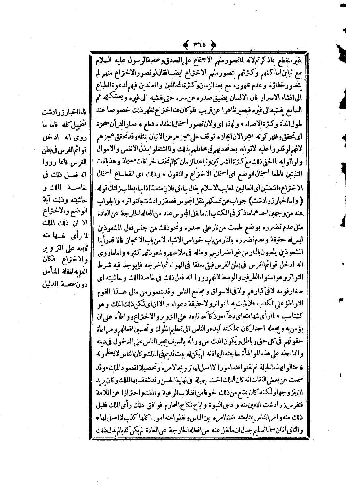 قَوْلُهُ (وَأَمَّا أَخْبَارُ زَرَادُشْتَ) جَوَابٌ عَنْ تَمَسُّكِهِمْ بِنَقْلِ الْمَجُوسِ قِصَّةَ زَرَادُشْتَ بِالتَّوَاتُرِ. وَالْجَوَابُ عَنْهُ مِنْ وَجْهَيْنِ: أَحَدُهُمَا مَا ذَكَرَ فِي الْكِتَابِ أَنَّ مَا نَقَلَ الْمَجُوسُ عَنْهُ مِنْ أَفْعَالِهِ الْخَارِجَةِ عَنْ الْعَادَةِ مِثْلُ عَدَمِ تَضَرُّرِهِ بِوَضْعِ طَسْتٍ مِنْ نَارٍ عَلَى صَدْرِهِ، وَنَحْوُ ذَلِكَ مِنْ جِنْسِ فِعْلِ الْمُشَعْوِذِينَ لَيْسَ لَهُ حَقِيقَةٌ، وَعَدَمُ تَضَرُّرِهِ بِالنَّارِ مِنْ بَابِ خَوَاصِّ الْأَشْيَاءِ لَا مِنْ بَابِ الْإِعْجَازِ فَأَنَّا قَدْ رَأَيْنَا الْمُشَعْوِذِينَ يَلْعَبُونَ بِالنَّارِ مِنْ غَيْرِ إضْرَارٍ بِهِمْ، وَمِثْلُهُ فِي مَلَاعِبِهِمْ وَشَعْوَذَتِهِمْ كَثِيرٌ.