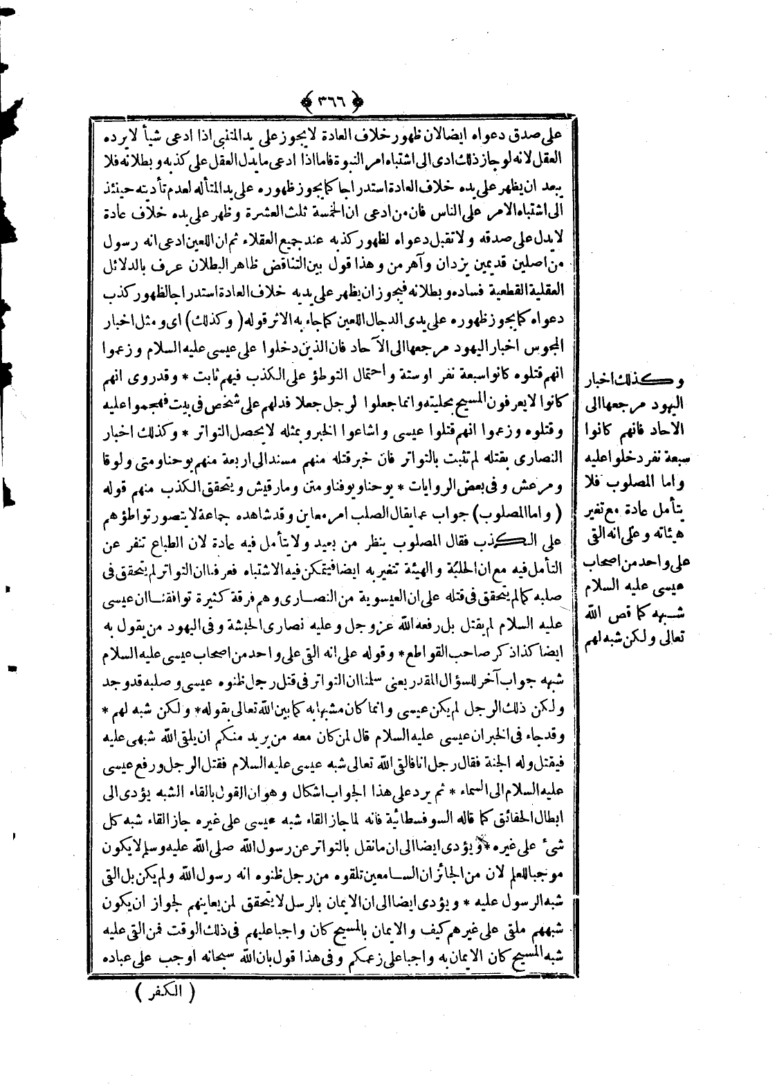وَقَوْلُهُ عَلَى أَنَّهُ أُلْقِيَ عَلَى وَاحِدٍ مِنْ أَصْحَابِ عِيسَى - عَلَيْهِ السَّلَامُ - شَبَهُهُ جَوَابٌ آخَرُ لِلسُّؤَالِ الْمُقَدَّرِ يَعْنِي سَلَّمْنَا أَنَّ التَّوَاتُرَ فِي قَتْلِ رَجُلٍ ظَنُّوهُ عِيسَى وَصَلْبُهُ قَدْ وُجِدَ، وَلَكِنَّ ذَلِكَ الرَّجُلَ لَمْ يَكُنْ عِيسَى، وَإِنَّمَا كَانَ مُشَبَّهًا بِهِ كَمَا بَيَّنَ اللَّهُ تَعَالَى بِقَوْلِهِ: {وَلَكِنْ شُبِّهَ لَهُمْ} [النساء: 157] . وَقَدْ جَاءَ فِي الْخَبَرِ «أَنَّ عِيسَى - عَلَيْهِ السَّلَامُ - قَالَ لِمَنْ كَانَ مَعَهُ مَنْ يُرِيدُ مِنْكُمْ أَنْ يُلْقِيَ اللَّهُ شَبَهِي عَلَيْهِ فَيُقْتَلَ، وَلَهُ الْجَنَّةُ فَقَالَ رَجُلٌ أَنَا فَأَلْقَى اللَّهُ تَعَالَى شَبَهَ عِيسَى - عَلَيْهِ السَّلَامُ - فَقُتِلَ الرَّجُلُ وَرُفِعَ عِيسَى - عَلَيْهِ السَّلَامُ - إلَى السَّمَاءِ» .