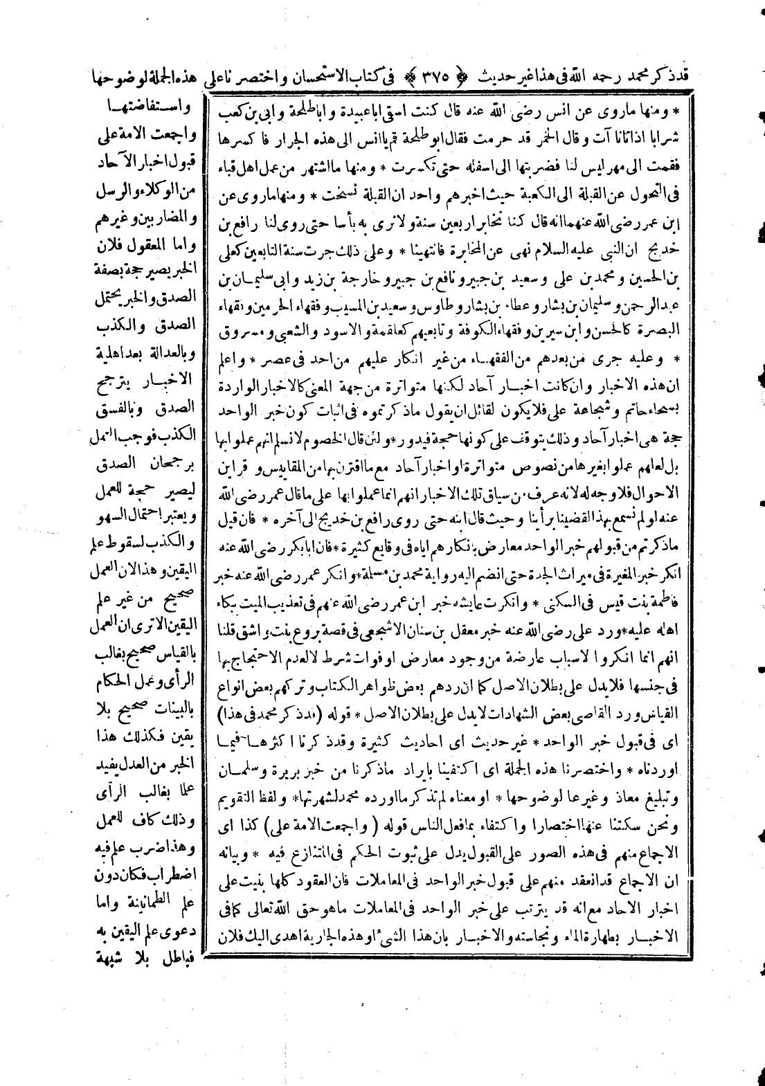 قَدْ ذَكَرَ مُحَمَّدٌ - رَحِمَهُ اللَّهُ - فِي هَذَا غَيْرَ حَدِيثٍ فِي كِتَابِ الِاسْتِحْسَانِ وَاخْتَصَرْنَا عَلَى هَذِهِ الْجُمْلَةِ لِوُضُوحِهَا وَاسْتِفَاضَتِهَا، وَأَجْمَعَتْ الْأُمَّةُ عَلَى قَبُولِ أَخْبَارِ الْآحَادِ مِنْ الْوُكَلَاءِ وَالرُّسُلِ وَالْمُضَارِبِينَ وَغَيْرِهِمْ، وَأَمَّا الْمَعْقُولُ فَلِأَنَّ الْخَبَرَ يَصِيرُ حُجَّةً بِصِفَةِ الصِّدْقِ، وَالْخَبَرُ يَحْتَمِلُ الصِّدْقَ وَالْكَذِبَ وَبِالْعَدَالَةِ بَعْدَ أَهْلِيَّةِ الْأَخْبَارِ يَتَرَجَّحُ الصِّدْقُ وَبِالْفِسْقِ الْكَذِبُ فَوَجَبَ الْعَمَلُ بِرُجْحَانِ الصِّدْقِ لِيَصِيرَ حُجَّةً لِلْعَمَلِ وَيُعْتَبَرُ احْتِمَالُ السَّهْوِ وَالْكَذِبِ لِسُقُوطِ عِلْمِ الْيَقِينِ، وَهَذَا؛ لِأَنَّ الْعَمَلَ صَحِيحٌ مِنْ غَيْرِ عِلْمِ الْيَقِينِ أَلَا تَرَى أَنَّ الْعَمَلَ بِالْقِيَاسِ صَحِيحٌ بِغَالِبِ الرَّأْيِ وَعَمَلَ الْحُكَّامِ بِالْبَيِّنَاتِ صَحِيحٌ بِلَا يَقِينٍ فَكَذَلِكَ هَذَا الْخَبَرُ مِنْ الْعَدْلِ يُفِيدُ عِلْمًا بِغَالِبِ الرَّأْيِ وَذَلِكَ كَافٍ لِلْعَمَلِ، وَهَذَا ضَرْبُ عِلْمٍ فِيهِ اضْطِرَابٌ فَكَانَ دُونَ عِلْمِ الطُّمَأْنِينَةِ.